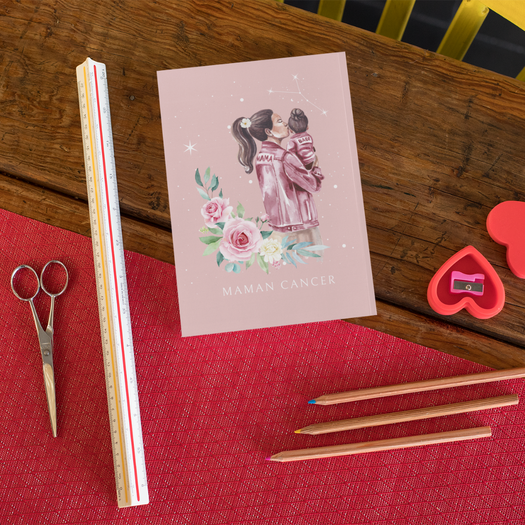 • Design raffiné : une illustration représentant une mère protectrice et bienveillante portant sa fille, avec en arrière-plan la constellation du Cancer, symbolisant l’empathie, l’intuition et un amour inconditionnel.