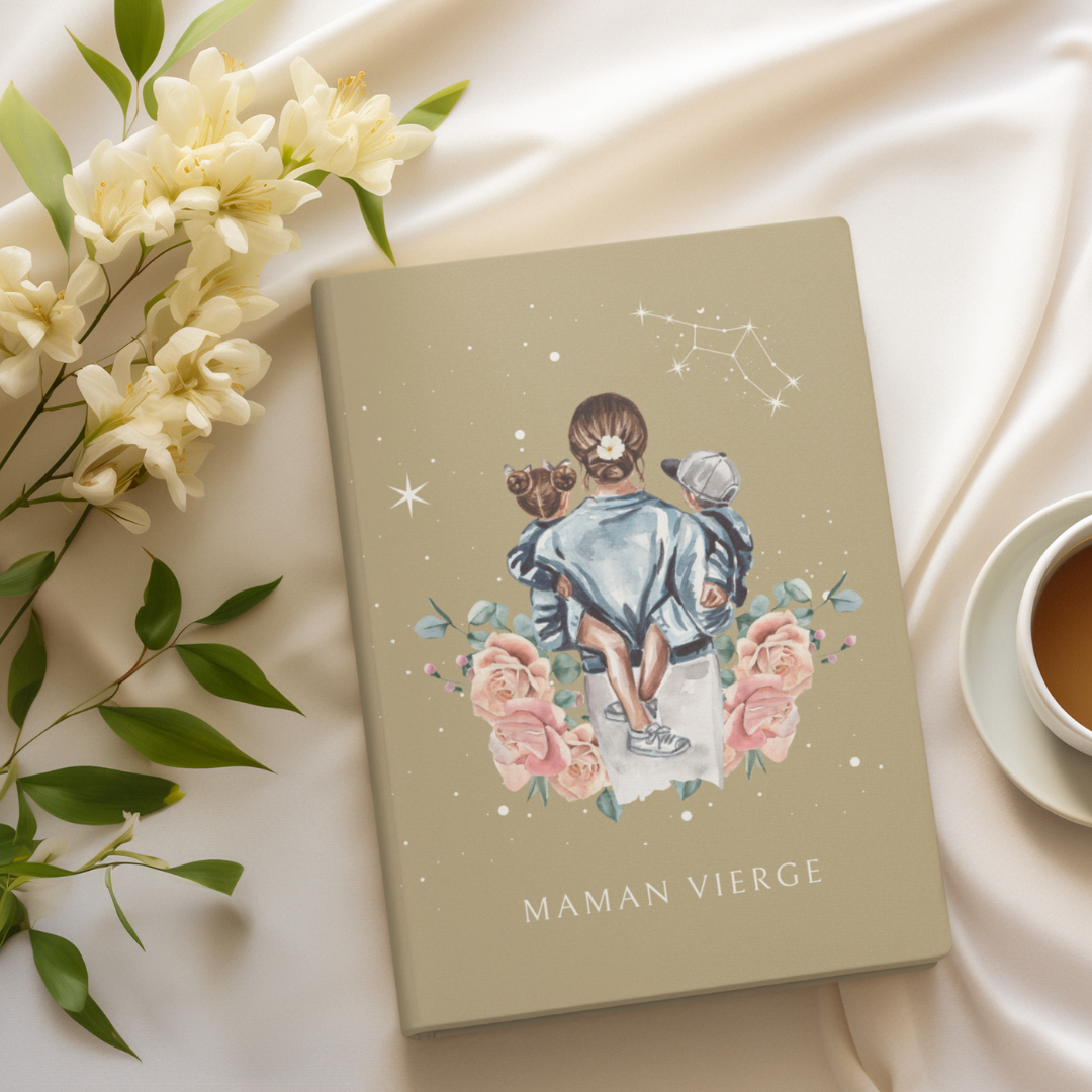 Découvrez notre carnet "Mère Vierge avec son fils et sa fille" – une œuvre délicate et organisée, célébrant l’amour maternel et la précision du signe astrologique Vierge. Ce carnet unique présente une illustration artistique d'une mère Vierge portant ses enfants dans les bras, sous un ciel étoilé représentant la constellation de la Vierge, capturant la nature attentionnée et pragmatique qui caractérise ce signe.