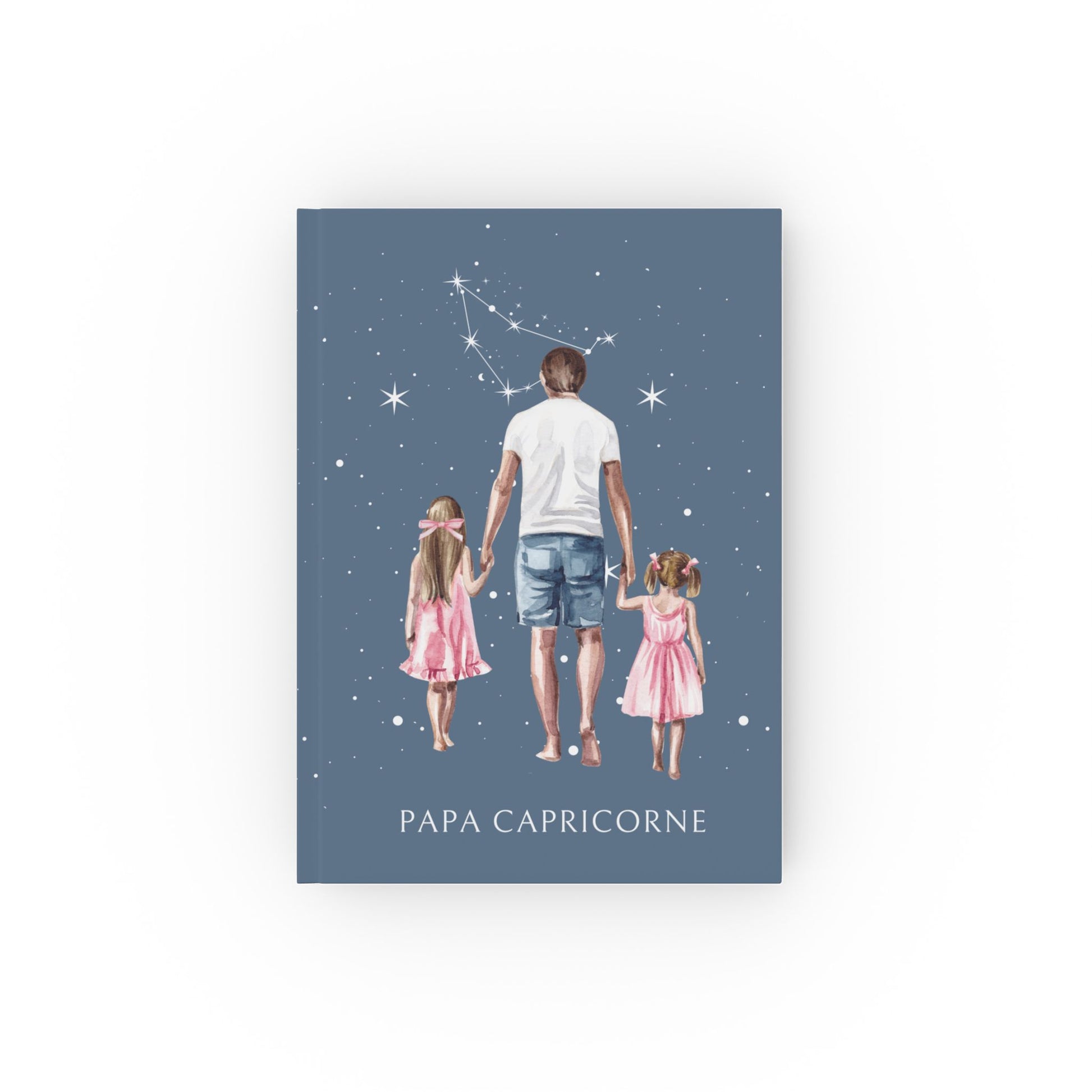 • Design raffiné : une illustration représentant un père patient et protecteur tenant ses filles, avec en arrière-plan la constellation du Capricorne, symbolisant la stabilité, la discipline et un amour constant et durable.