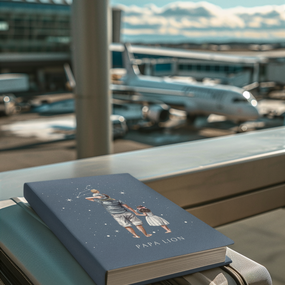 • Design raffiné : une illustration représentant un père fort et protecteur avec ses enfants, avec en arrière-plan la constellation du Lion, symbolisant la confiance, la générosité et un amour éclatant et indéfectible.