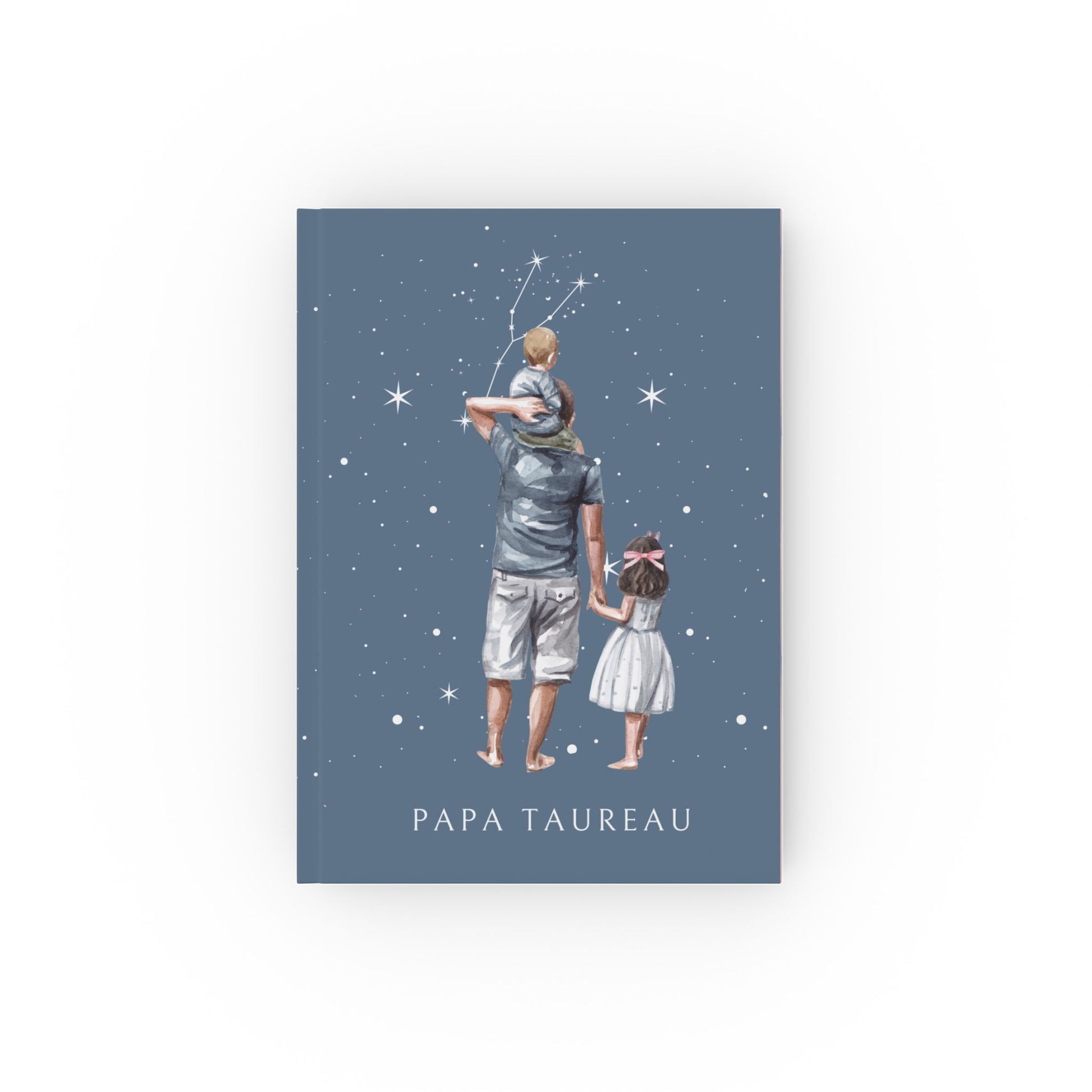 • Design raffiné : une illustration représentant un père solide et protecteur avec ses enfants, avec en arrière-plan la constellation du Taureau, symbolisant la stabilité, la patience et un amour infaillible.