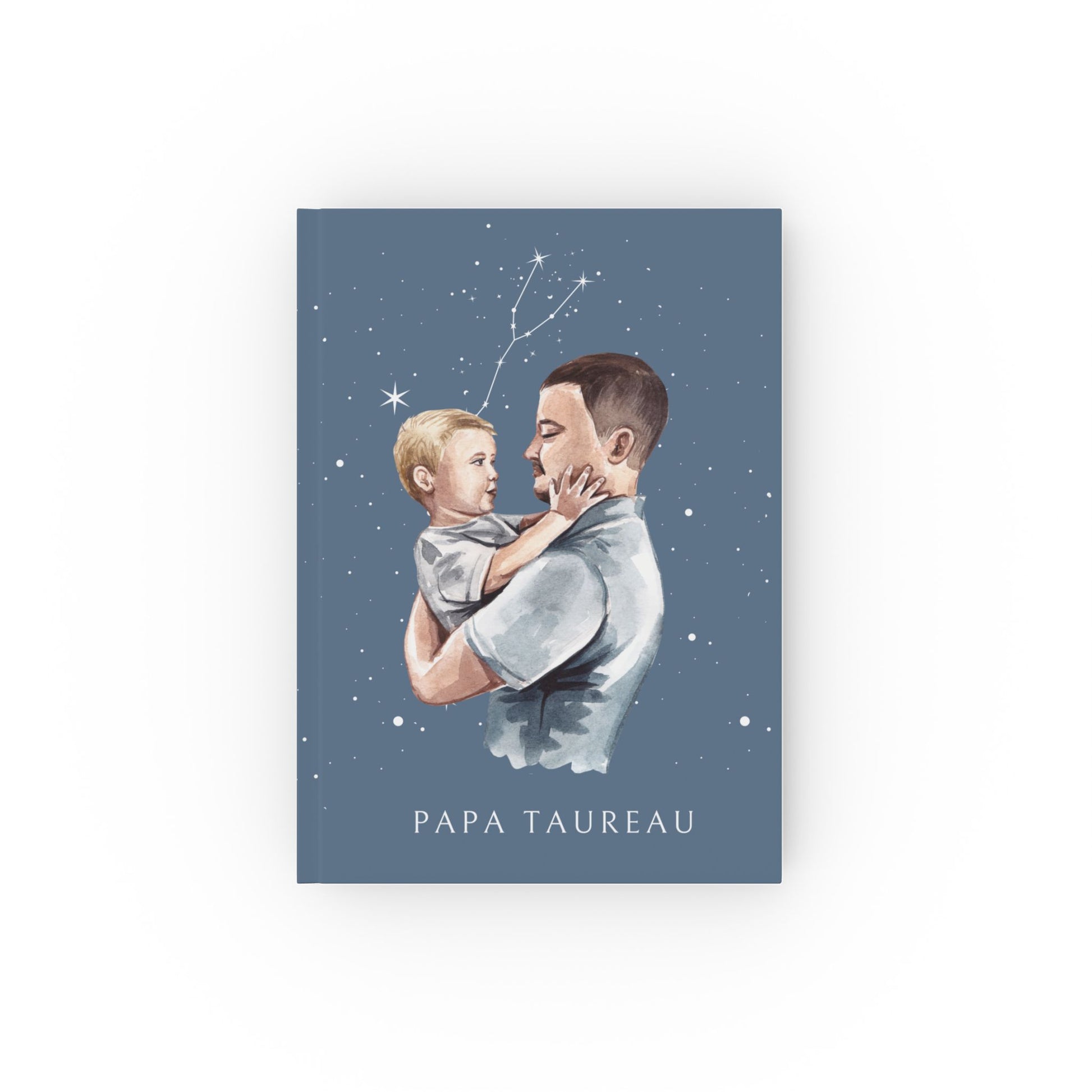 • Design raffiné : une illustration représentant un père solide et protecteur tenant son fils, avec en arrière-plan la constellation du Taureau, symbolisant la stabilité, la patience et un amour infaillible.