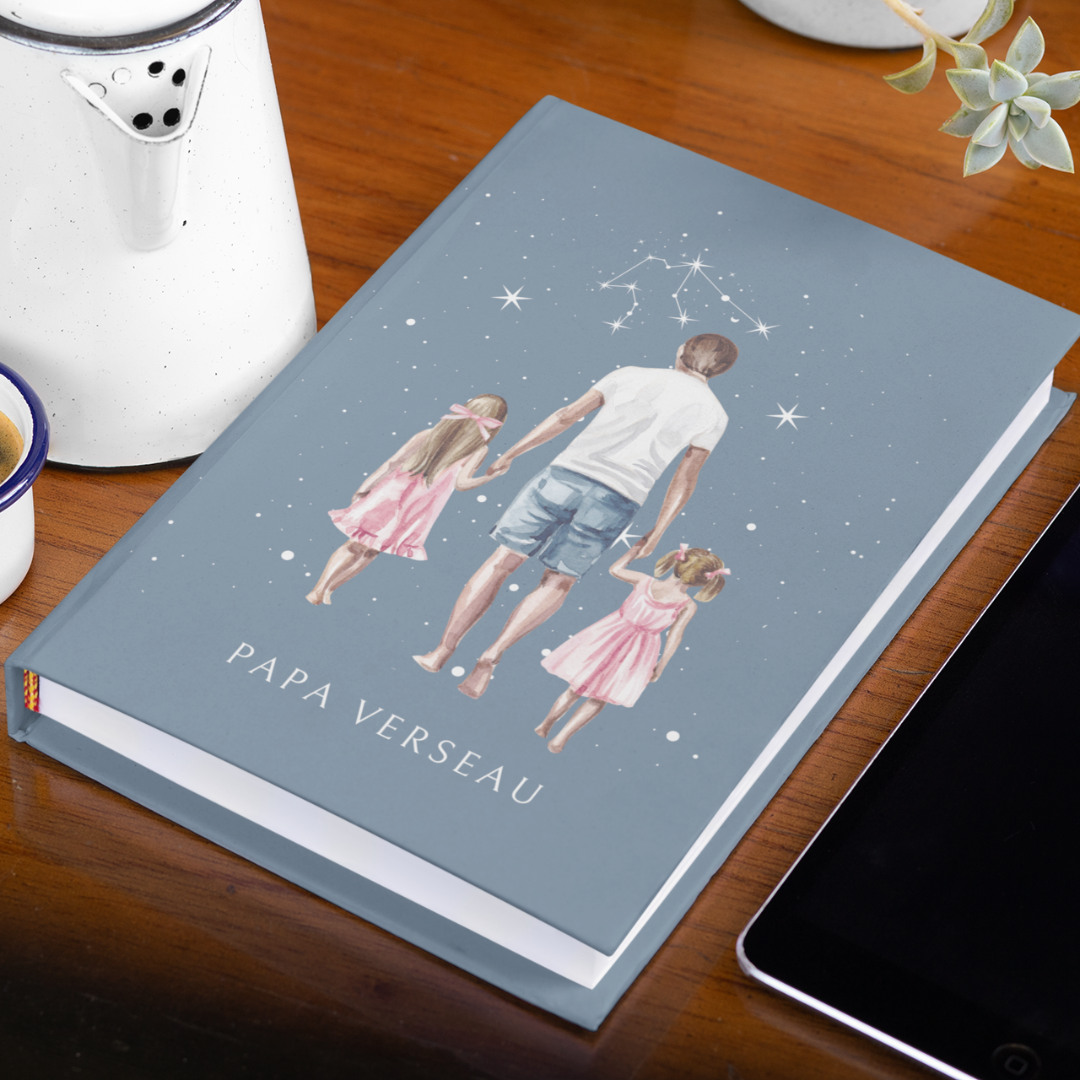 • Design raffiné : une illustration représentant un père imaginatif et protecteur tenant ses filles, avec en arrière-plan la constellation du Verseau, symbolisant l’originalité, l’amitié et un amour inconditionnel et inspirant.