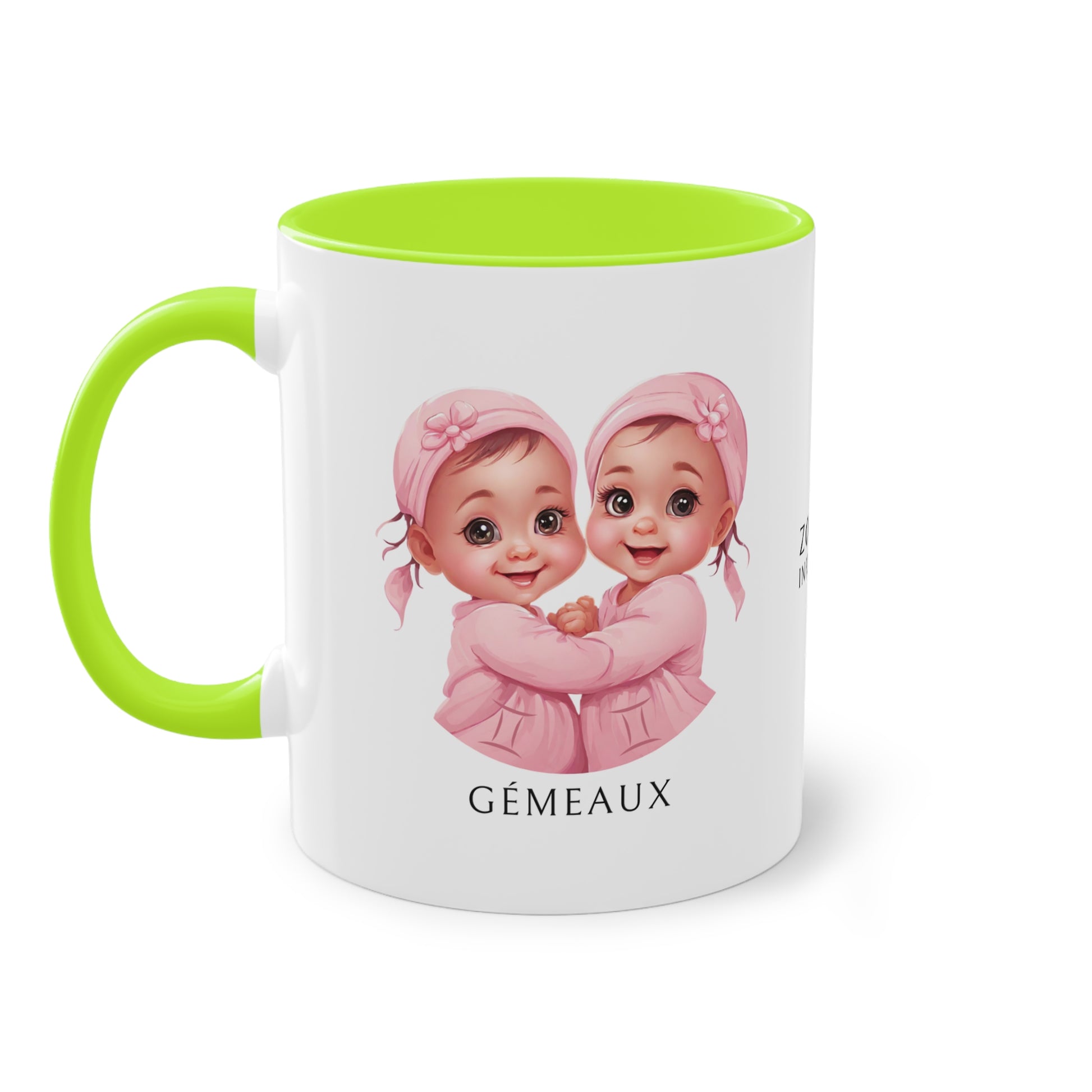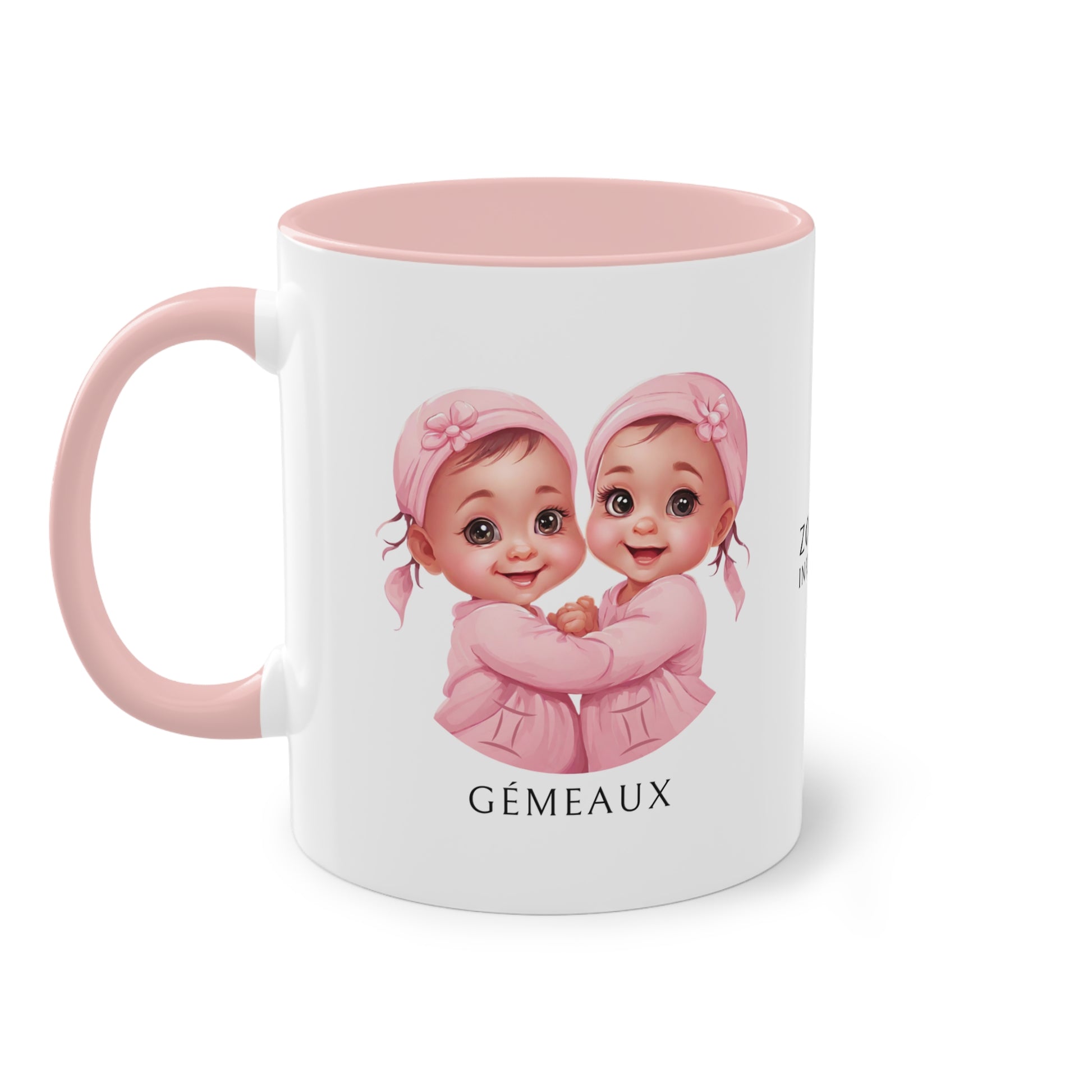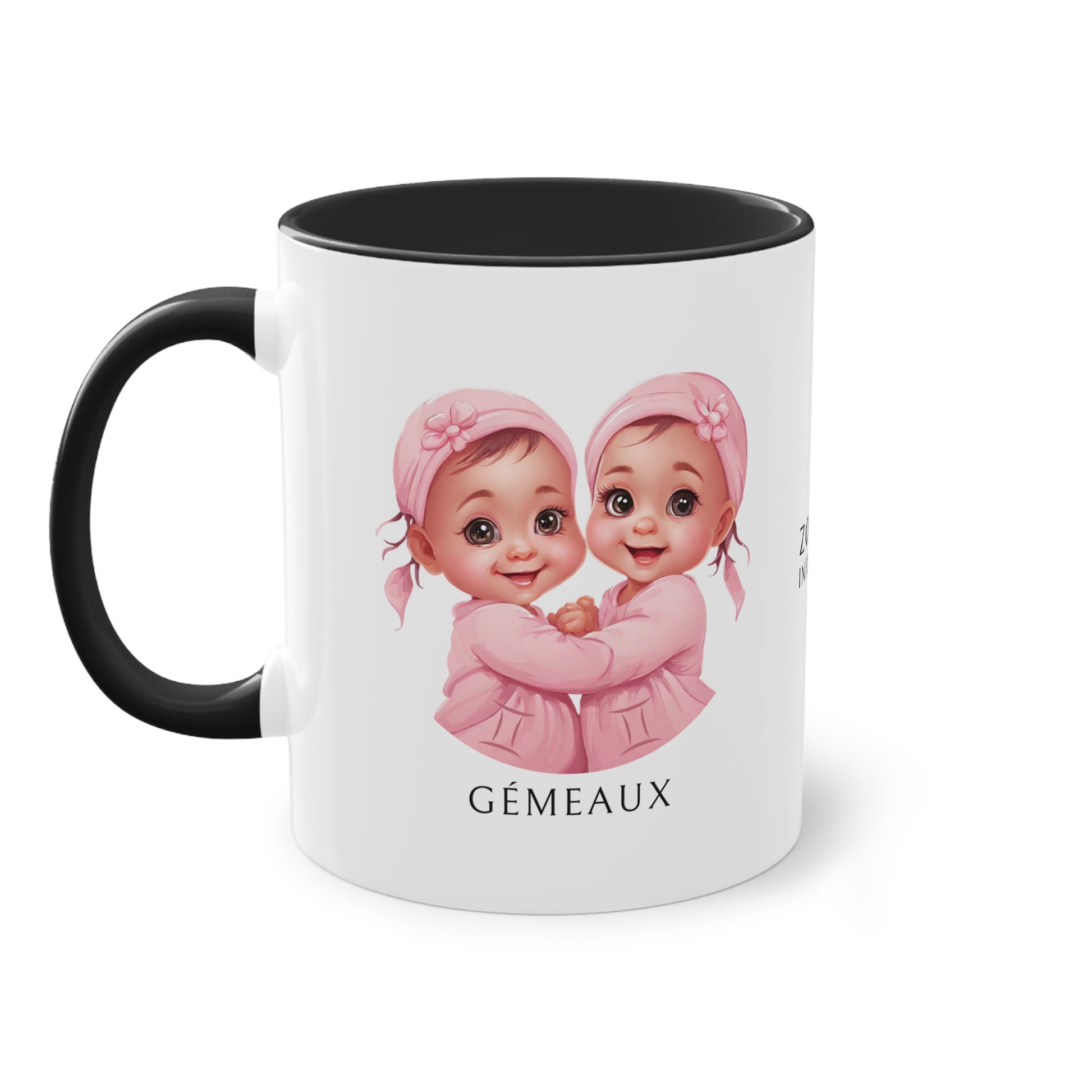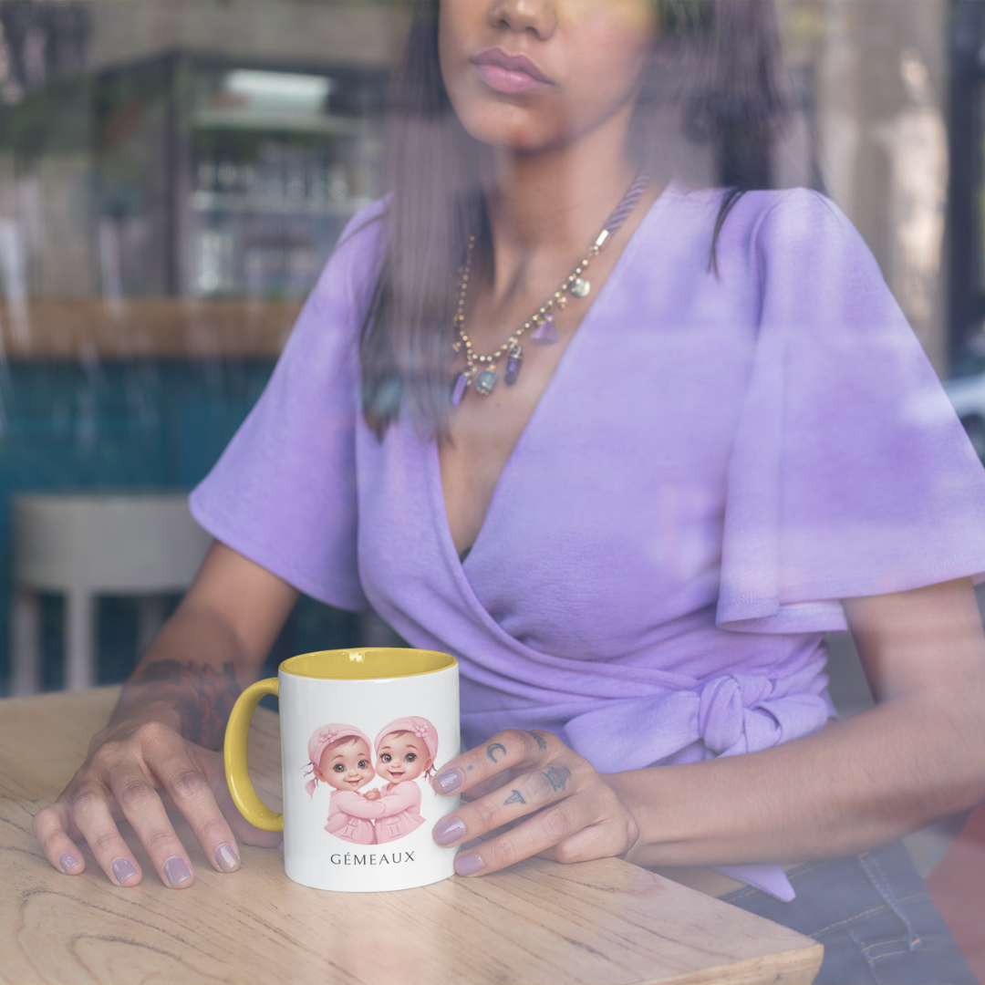 Ce magnifique mug en céramique est parfait pour toutes les occasions : café matinal, chocolat chaud ou toute autre boisson chaude. Blanc, avec un intérieur et une poignée de la couleur de votre choix, il est idéal pour les petites filles Gémeaux ou les femmes qui ont gardé leur âme d'enfant.