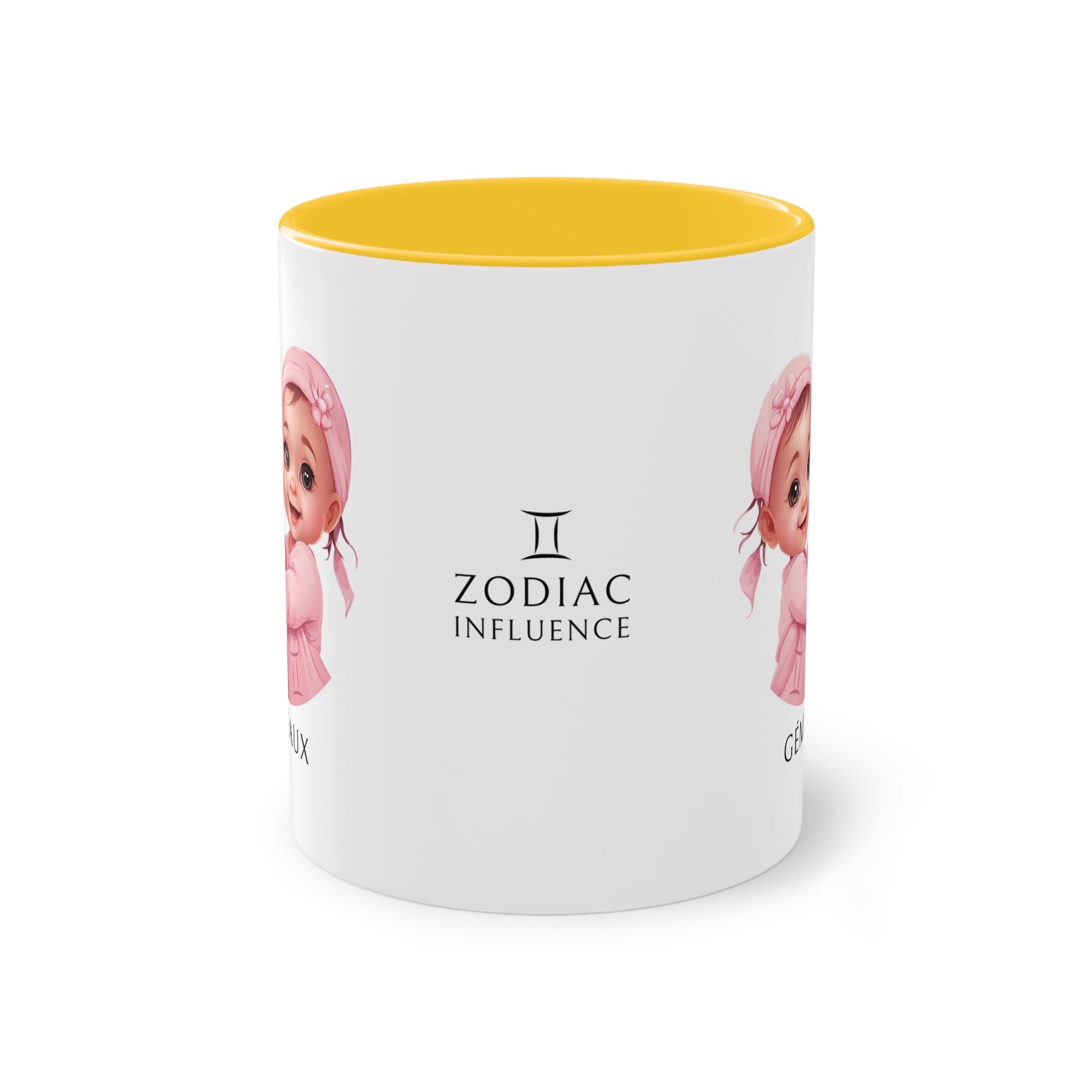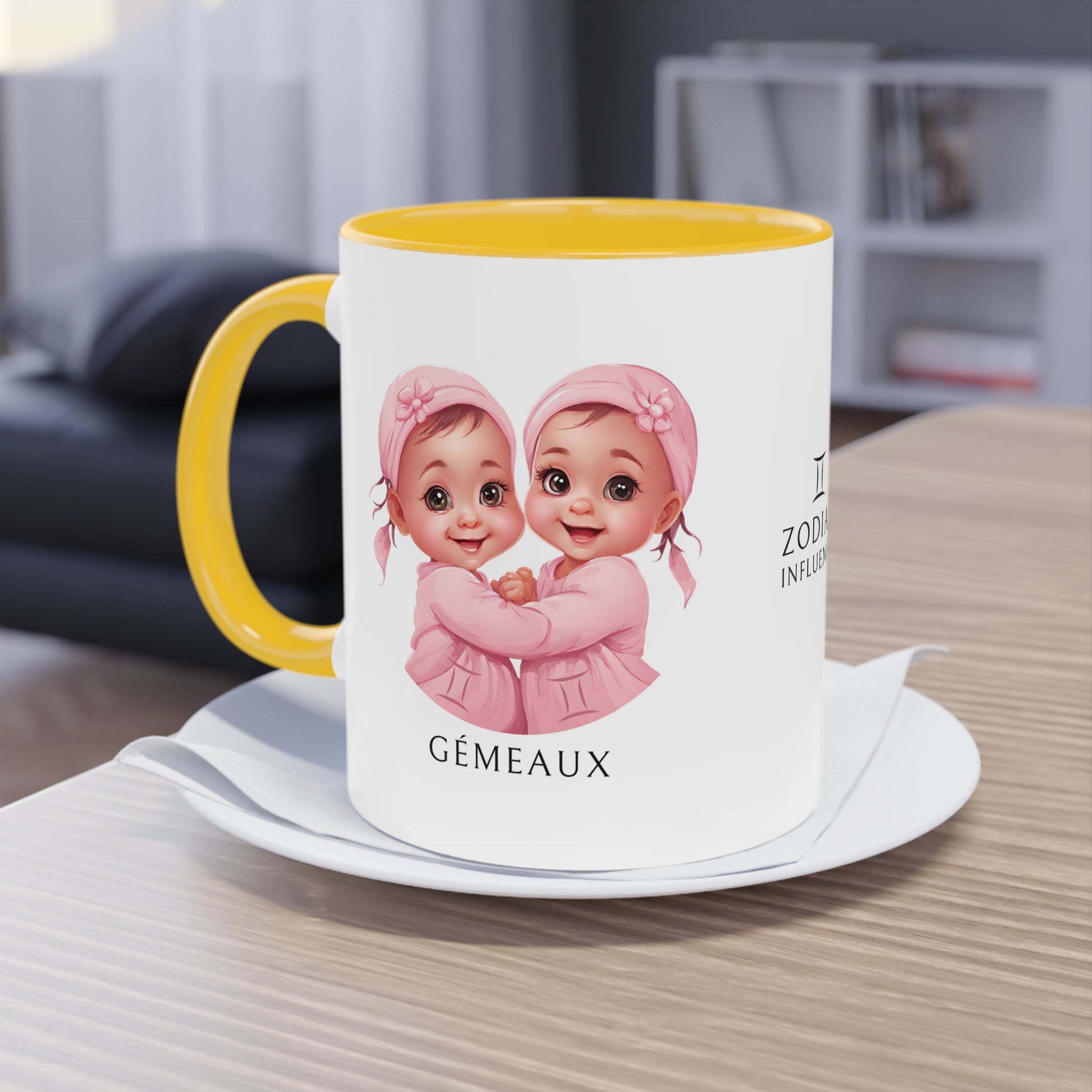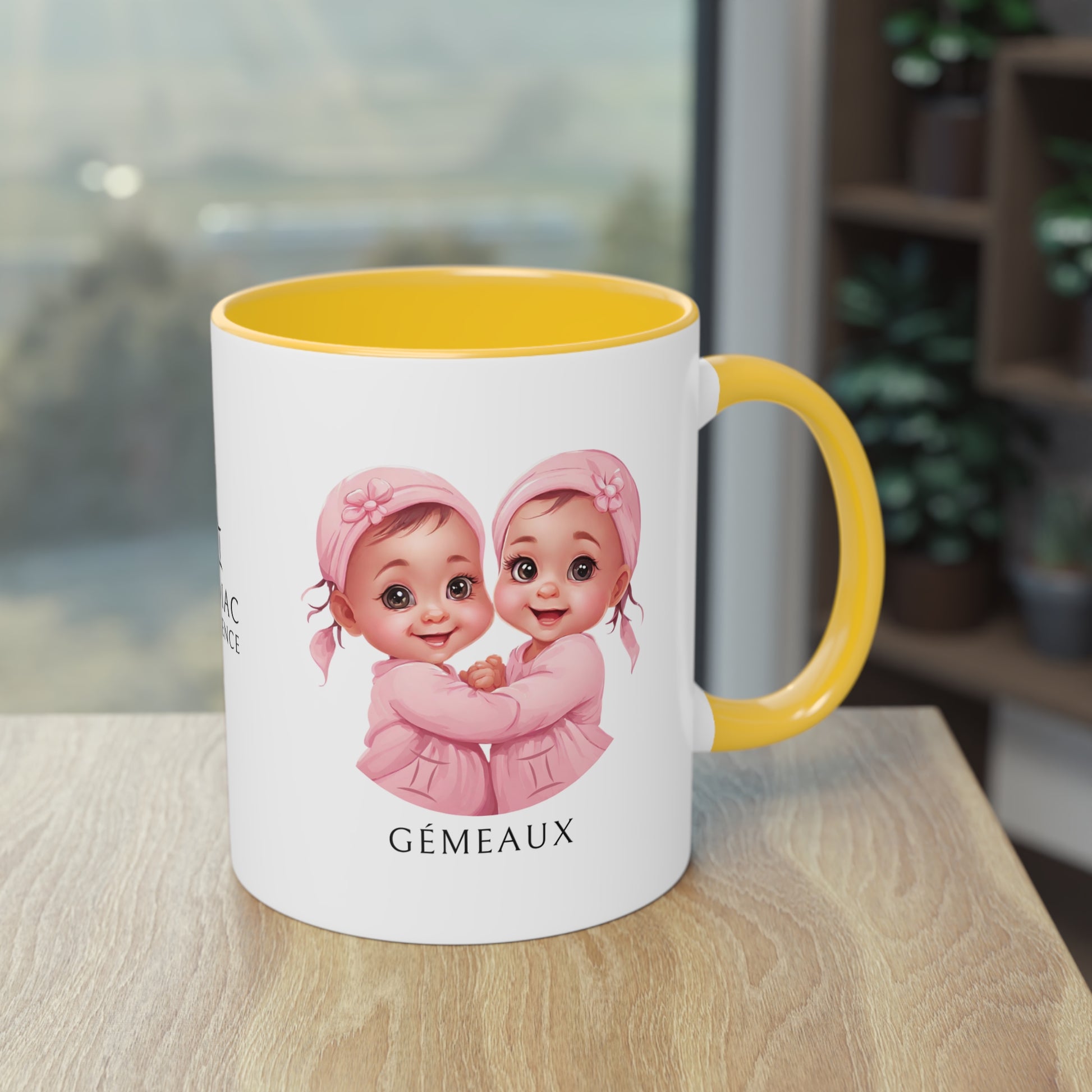 Ce magnifique mug en céramique est parfait pour toutes les occasions : café matinal, chocolat chaud ou toute autre boisson chaude. Blanc, avec un intérieur et une poignée de la couleur de votre choix, il est idéal pour les petites filles Gémeaux ou les femmes qui ont gardé leur âme d'enfant.