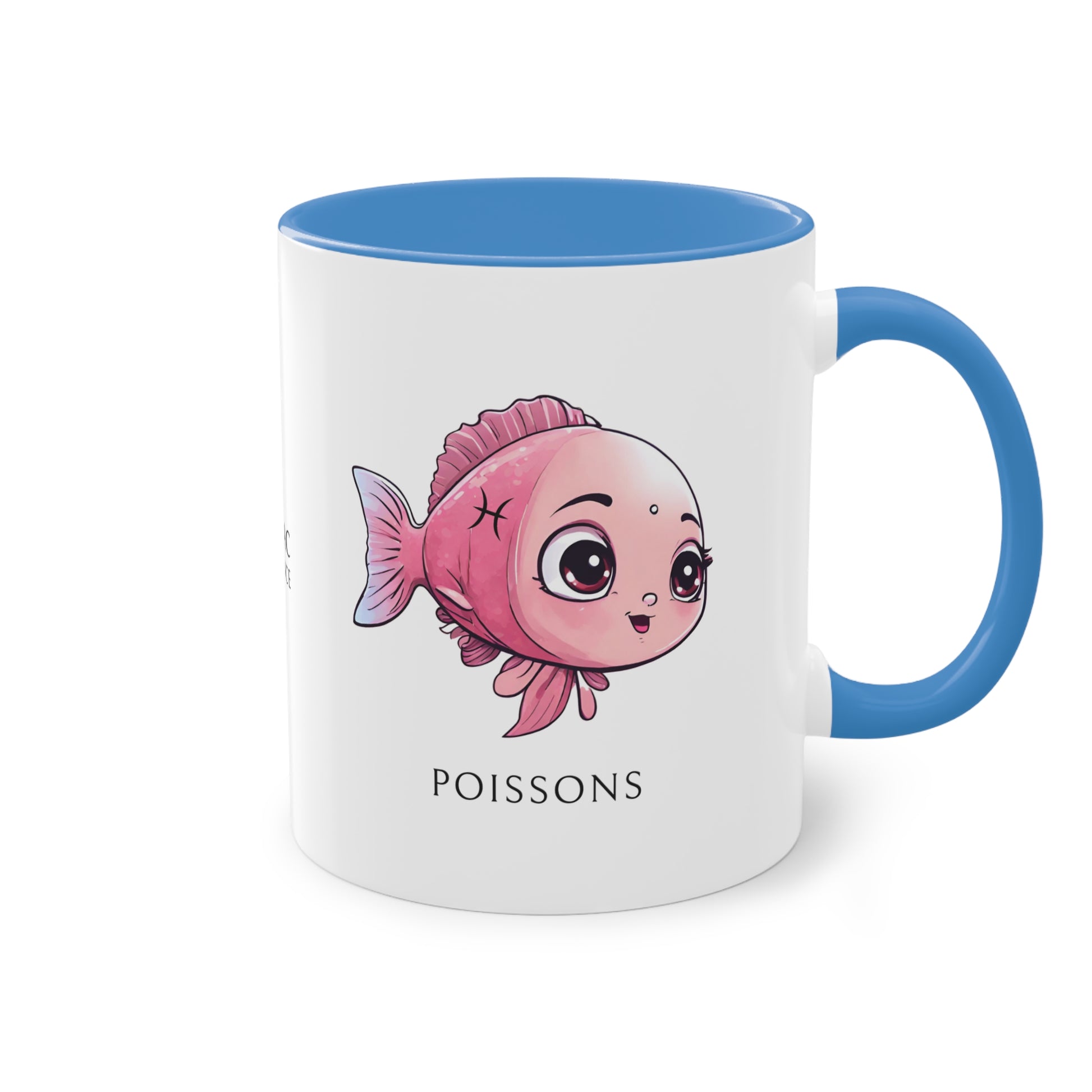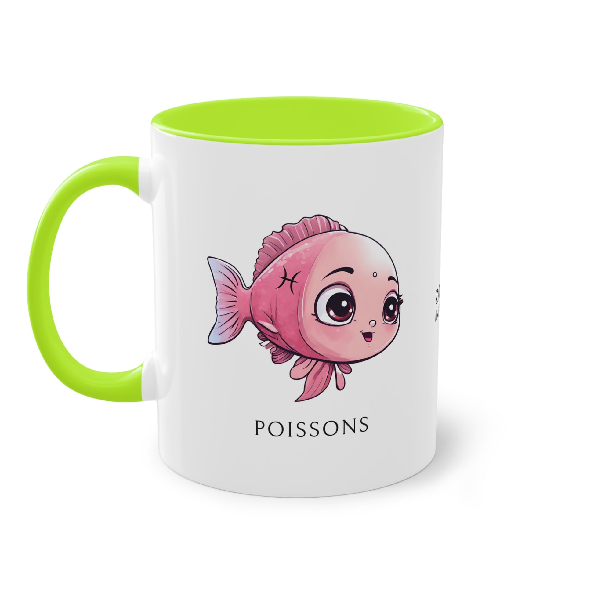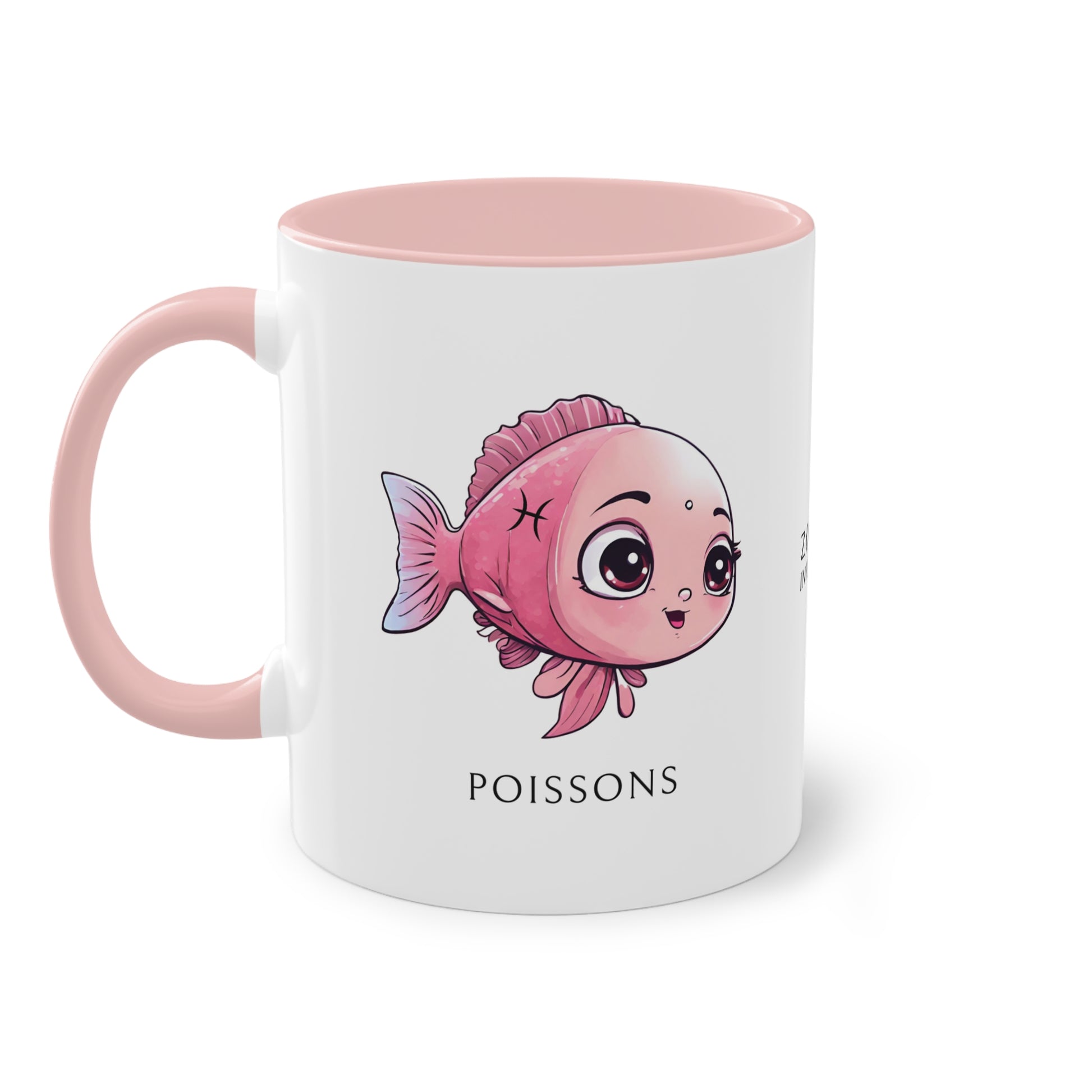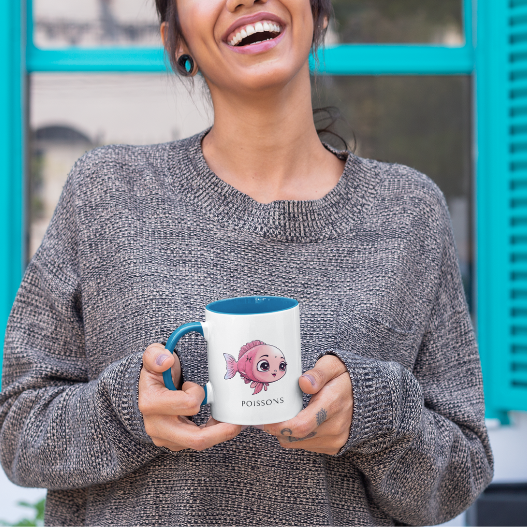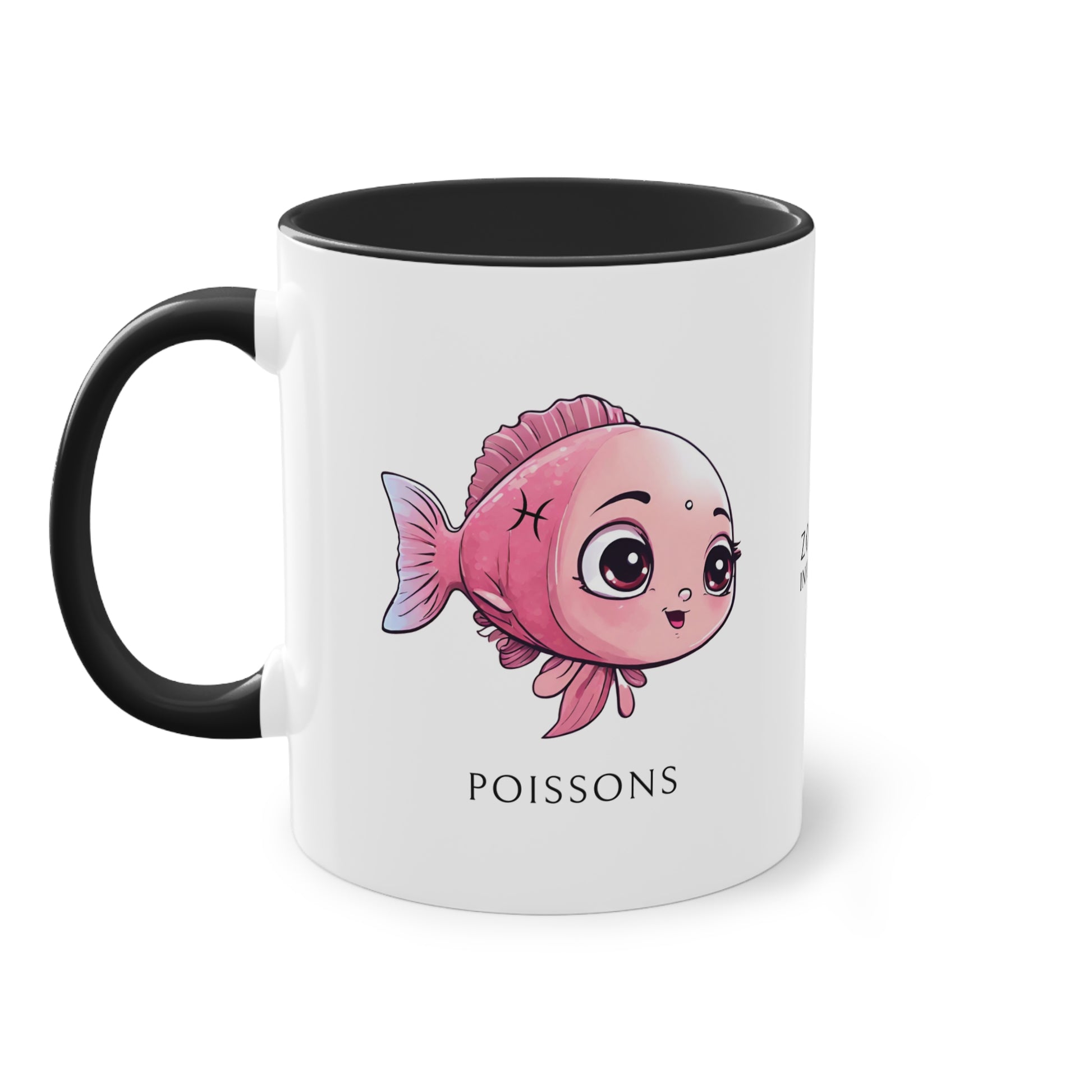 Ce magnifique mug en céramique est parfait pour toutes les occasions : café matinal, chocolat chaud ou toute autre boisson chaude. Blanc, avec un intérieur et une poignée de la couleur de votre choix, il est idéal pour les petites filles Poissons ou les femmes qui ont gardé leur âme d'enfant.