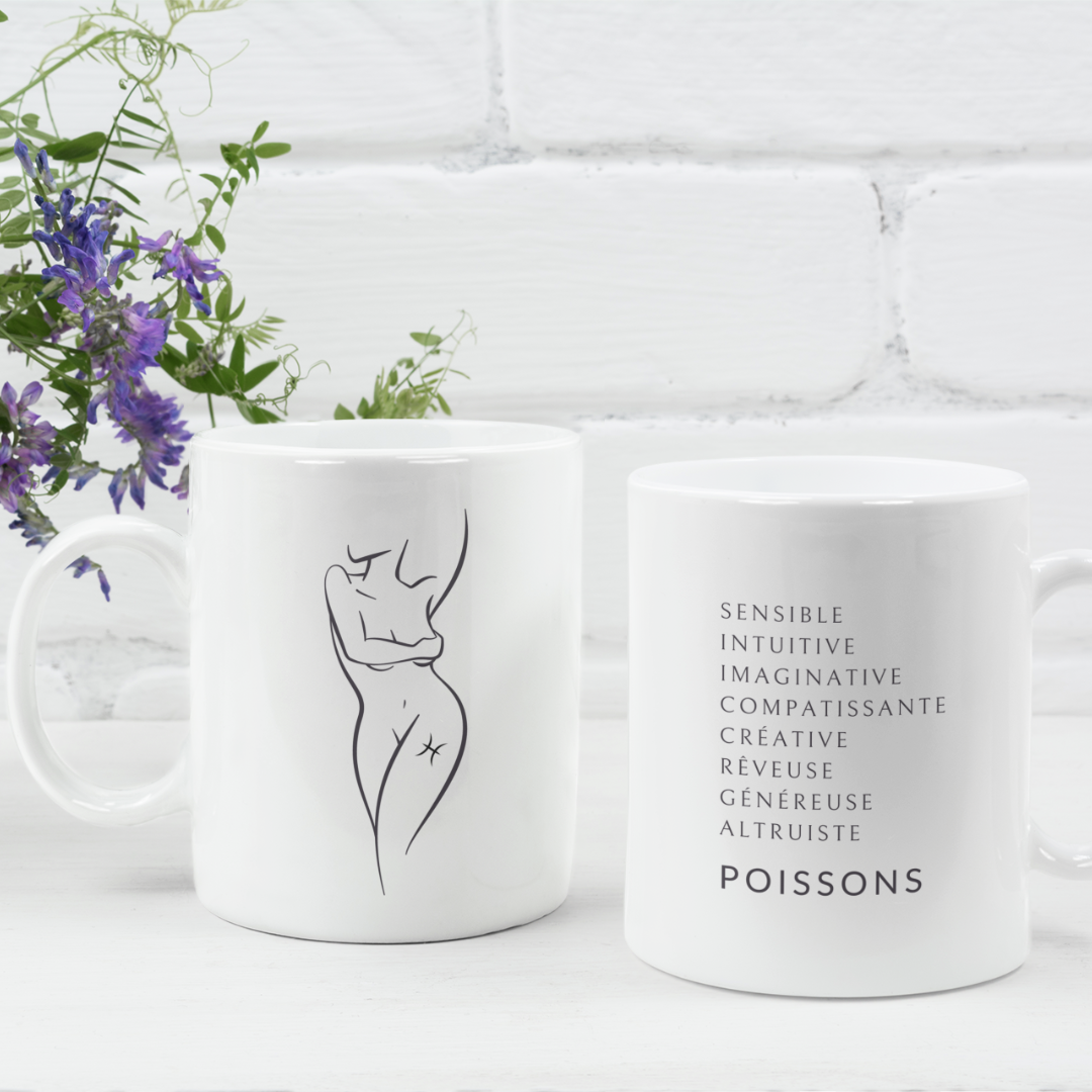 Transformez chaque moment avec ce mug dédié à la Femme Poissons, une véritable célébration de votre intuition et de votre sensibilité. L'illustration met en valeur vos qualités uniques : compassion, imagination et rêve, transformant chaque gorgée en un hommage à votre profondeur émotionnelle et à votre nature rêveuse.