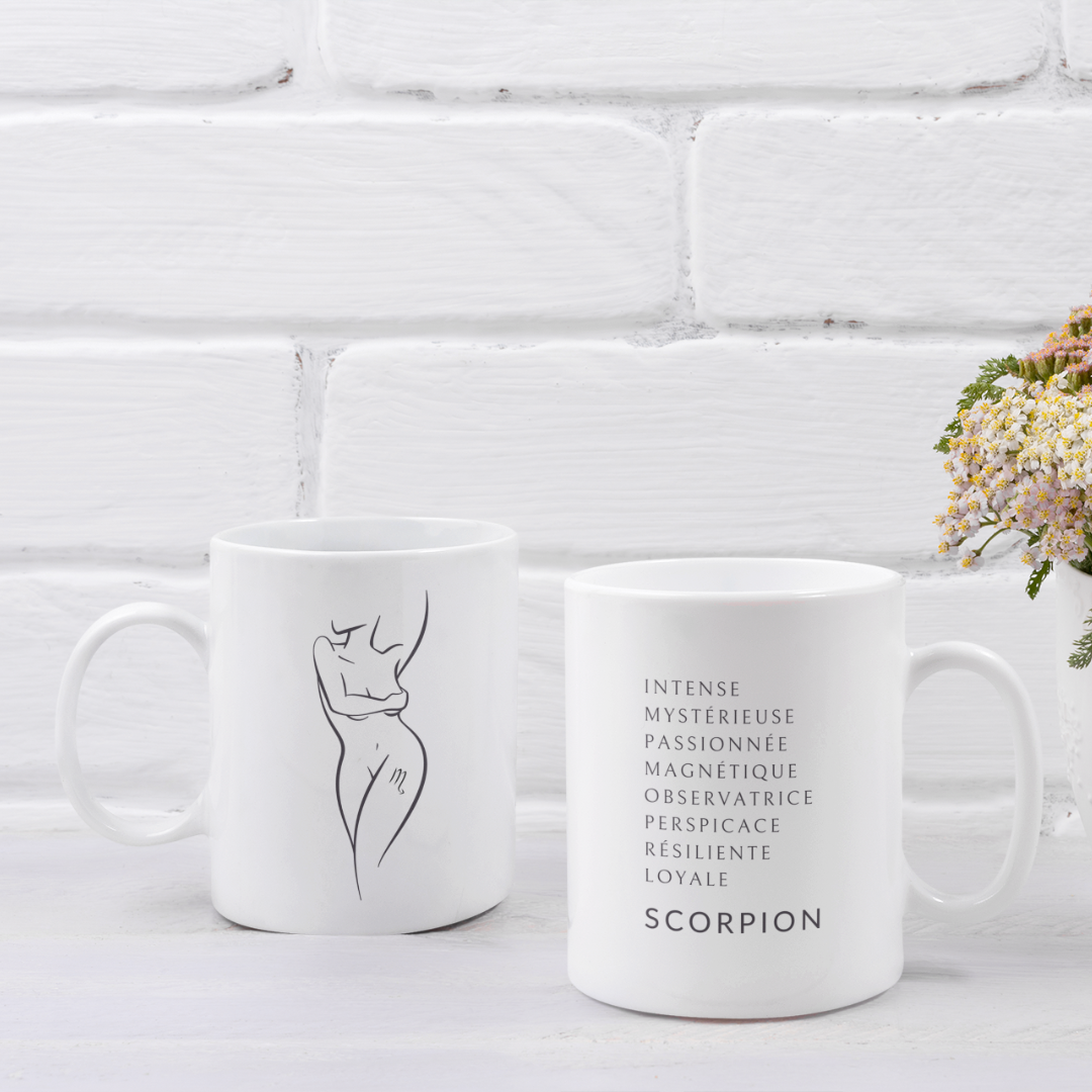 Sublimez chaque instant avec ce mug dédié à la Femme Scorpion, une véritable célébration de votre intensité et de votre mystère. L'illustration met en valeur vos qualités uniques : passion, détermination et profondeur, transformant chaque gorgée en un hommage à votre force intérieure et à votre esprit captivant.