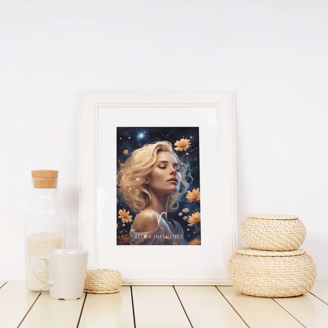 Sublimez votre espace avec ce poster inspirant, conçu pour les femmes nées sous le signe du Bélier. Entourée de fleurs et illuminée par un ciel étoilé, Gabrielle incarne la force et l’élan du Bélier.