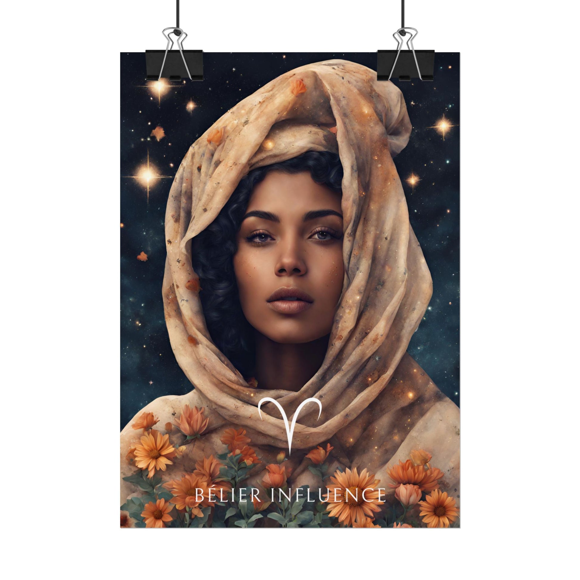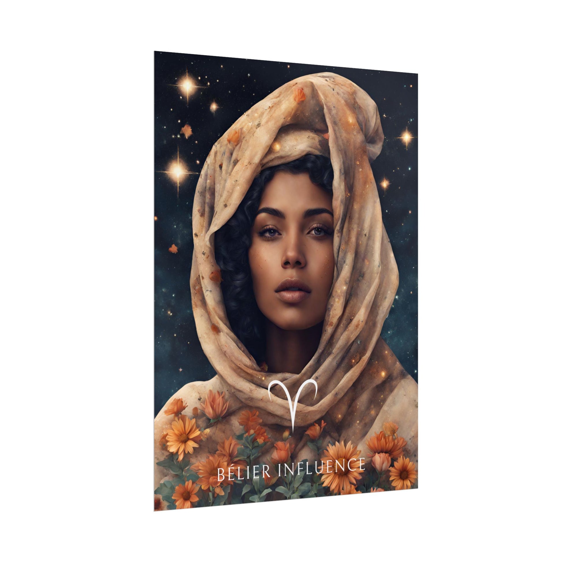 Sublimez votre espace avec ce poster inspirant, conçu pour les femmes nées sous le signe du Bélier. Entourée de fleurs et illuminée par un ciel étoilé, Jihane incarne la force et l’élan du Bélier.