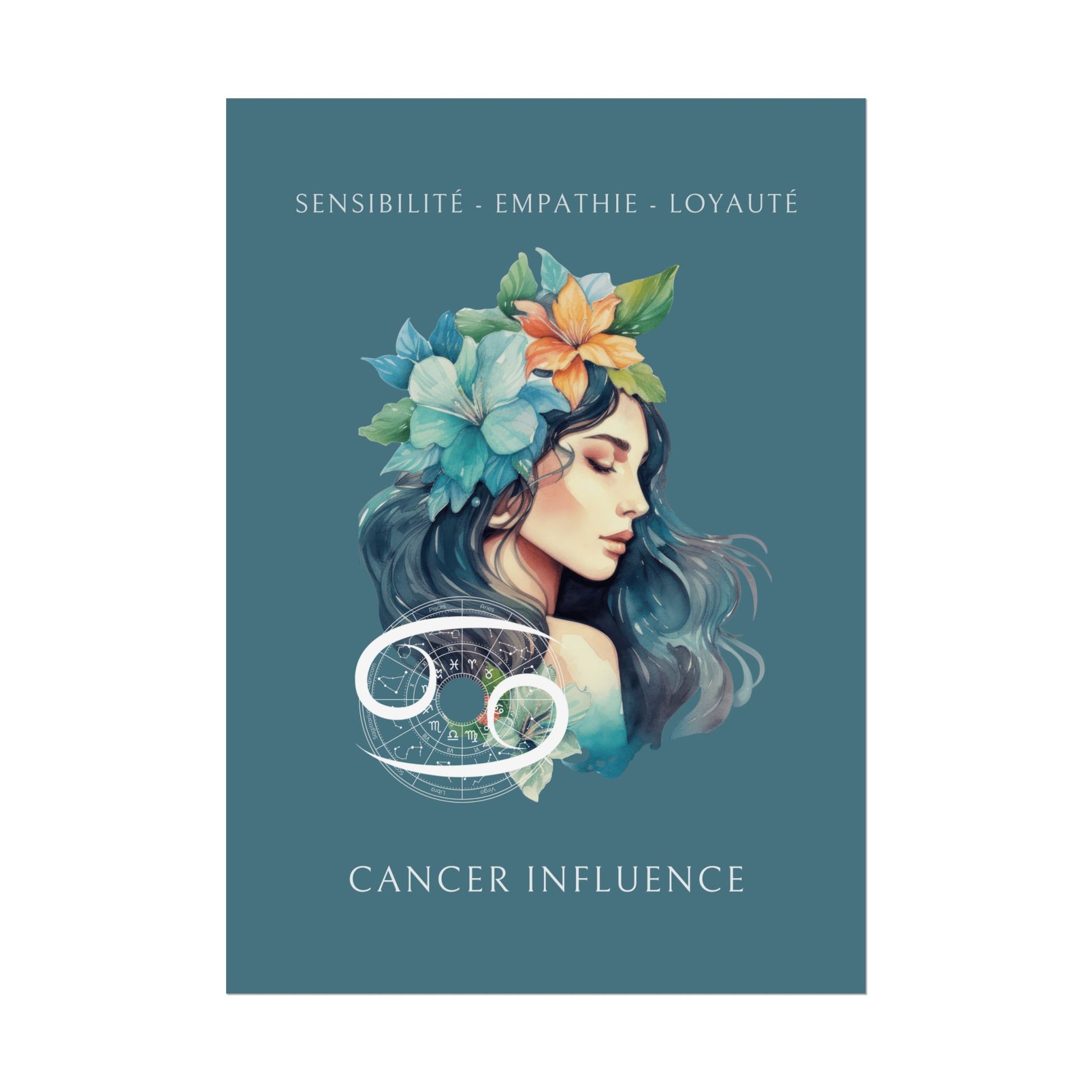 Exprimez la sensibilité et la douceur du signe du Cancer avec ce magnifique poster, conçu pour les femmes nées sous ce signe d'eau. L’illustration d'Aurélie, entourée de fleurs, capture l’essence du Cancer tout en mettant en avant ses qualités uniques : sensibilité, empathie et loyauté.