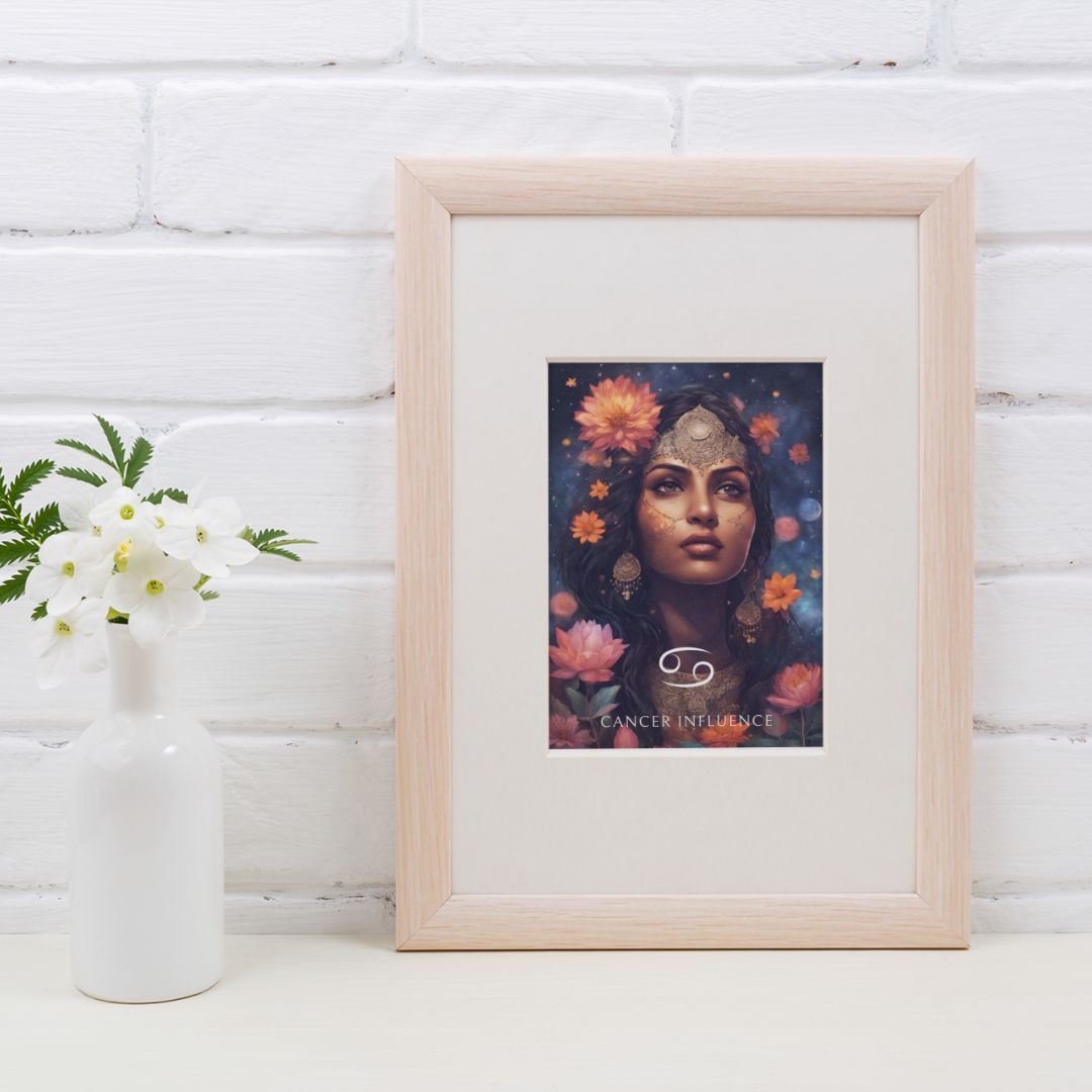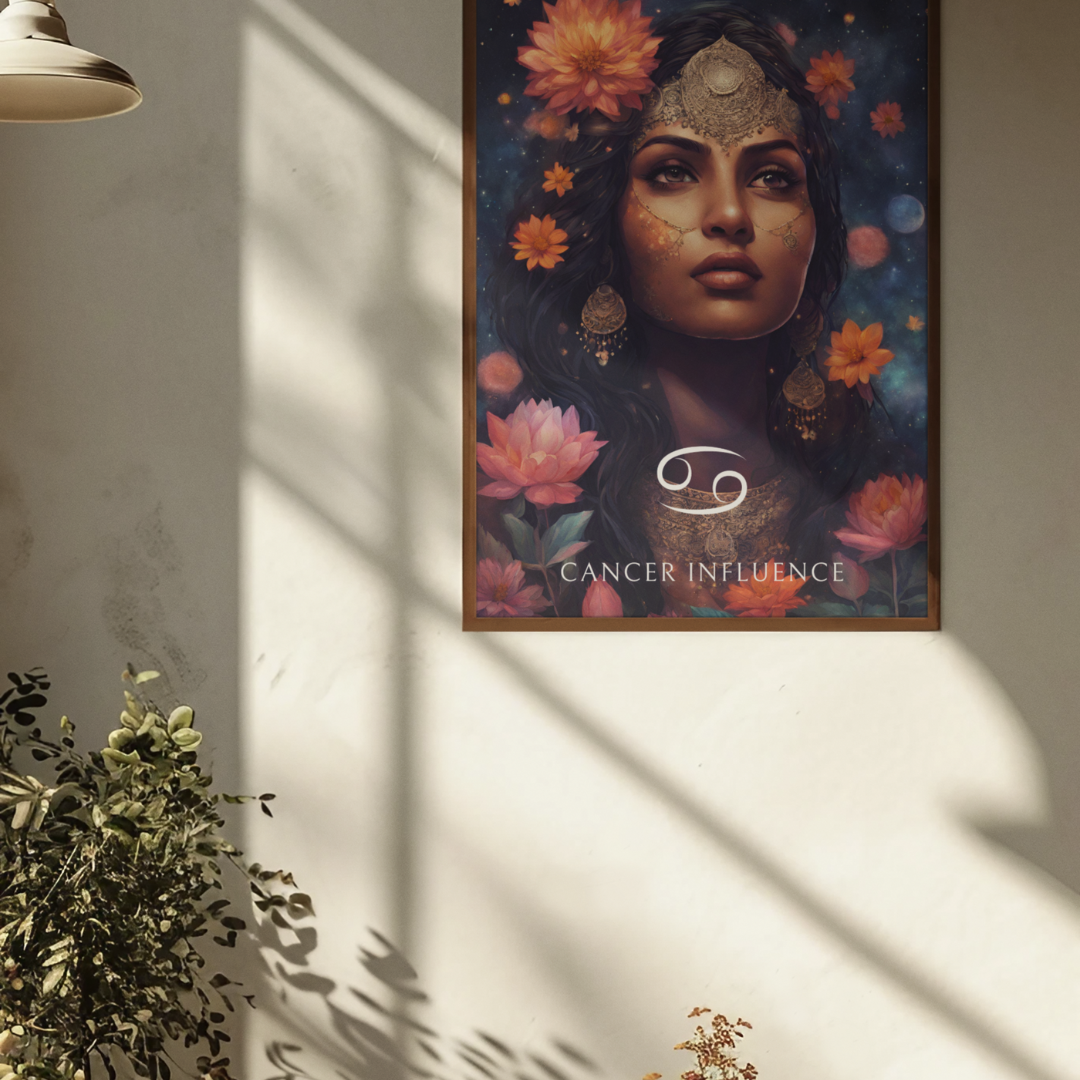 Apportez une ambiance douce et émotive à votre intérieur avec ce poster spécialement conçu pour les femmes nées sous le signe du Cancer. Entourée de fleurs sous un ciel étoilé, Lakshmi incarne l'essence de ce signe d'eau, protecteur et intuitif.