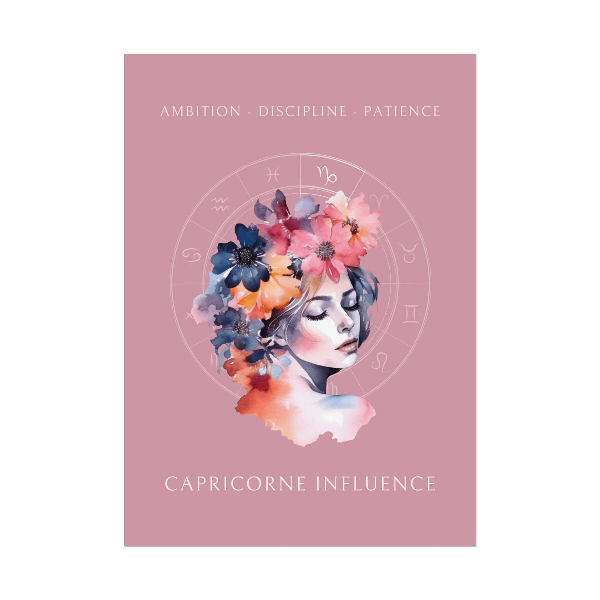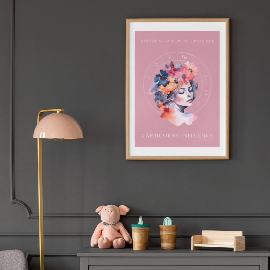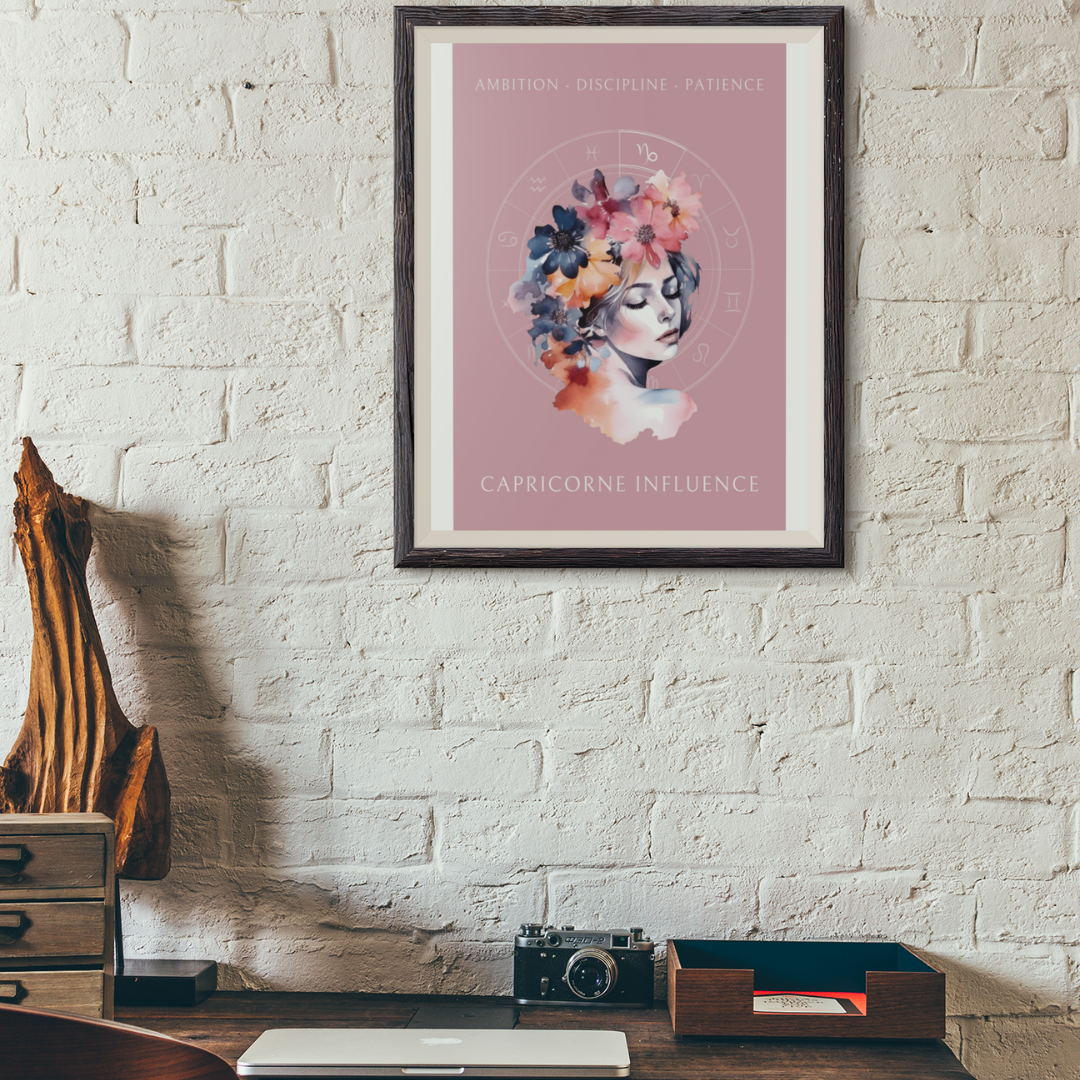 Exprimez l’ambition et la sagesse du signe du Capricorne avec ce magnifique poster, conçu pour les femmes nées sous ce signe de terre. L’illustration de Christine, entourée de fleurs, incarne l’essence du Capricorne tout en mettant en avant ses qualités uniques : ambition, discipline et patience.