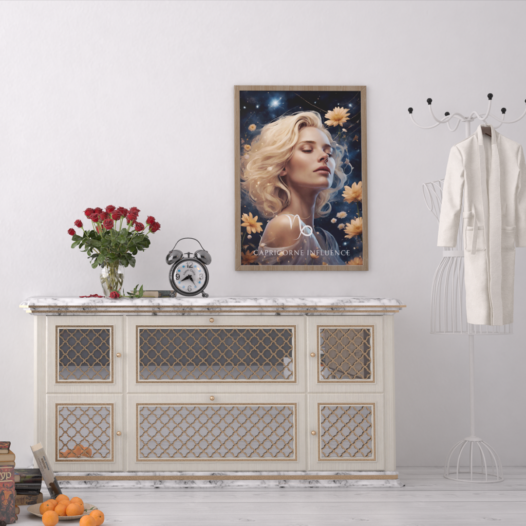 Apportez une touche d'élégance et de détermination à votre intérieur avec ce poster spécialement conçu pour les femmes nées sous le signe du Capricorne. Entourée de fleurs sous un ciel étoilé, Gabrielle incarne l'essence de ce signe de terre, ambitieux et patient.