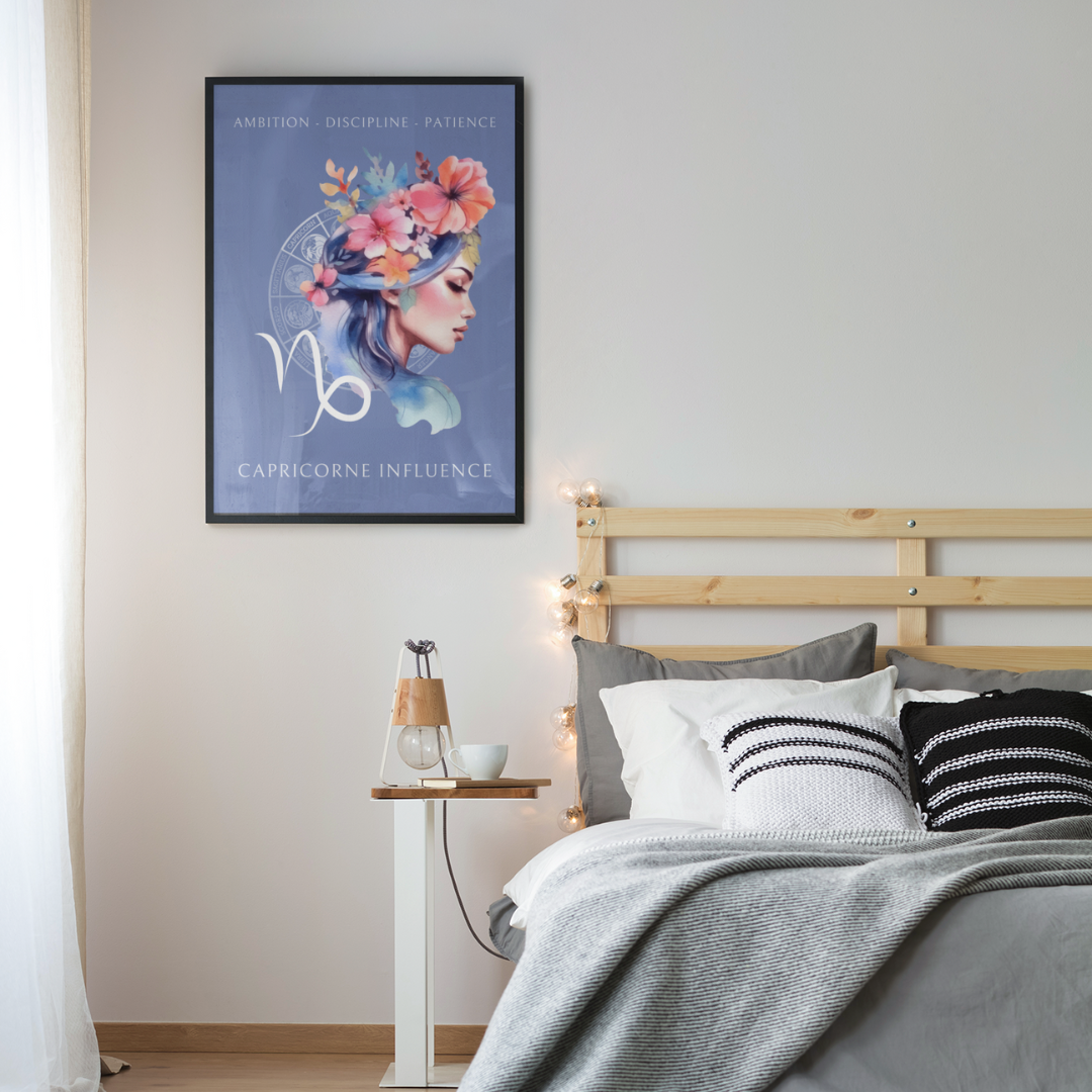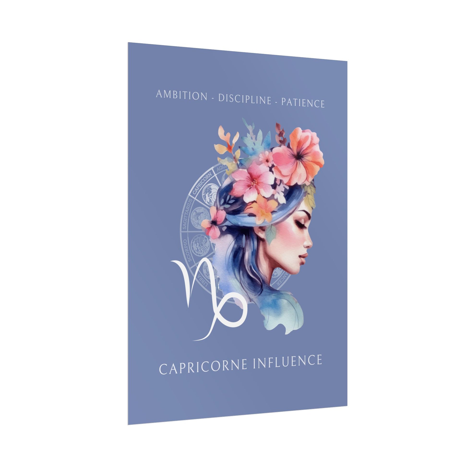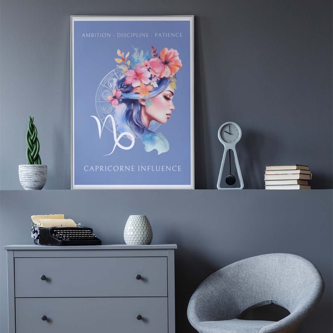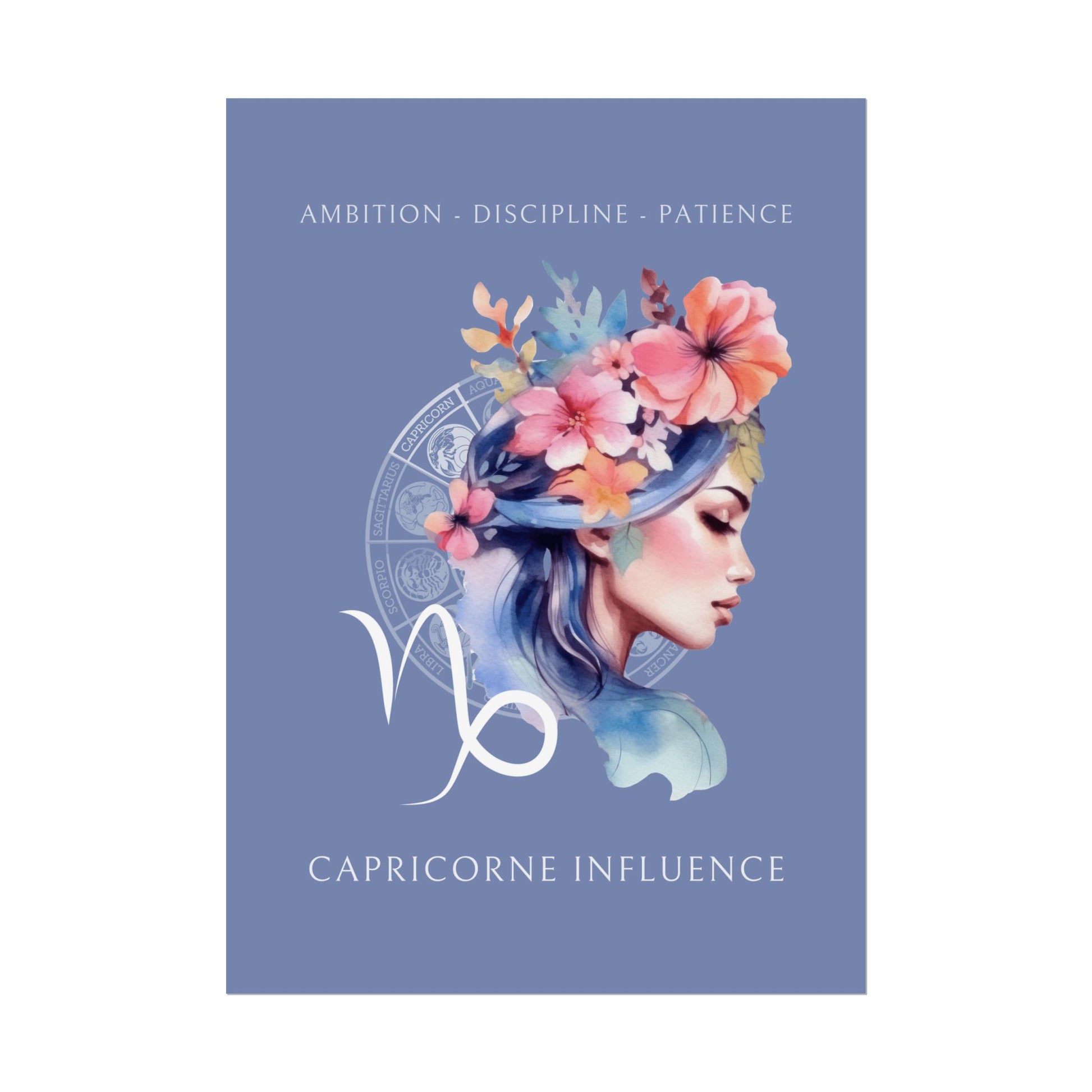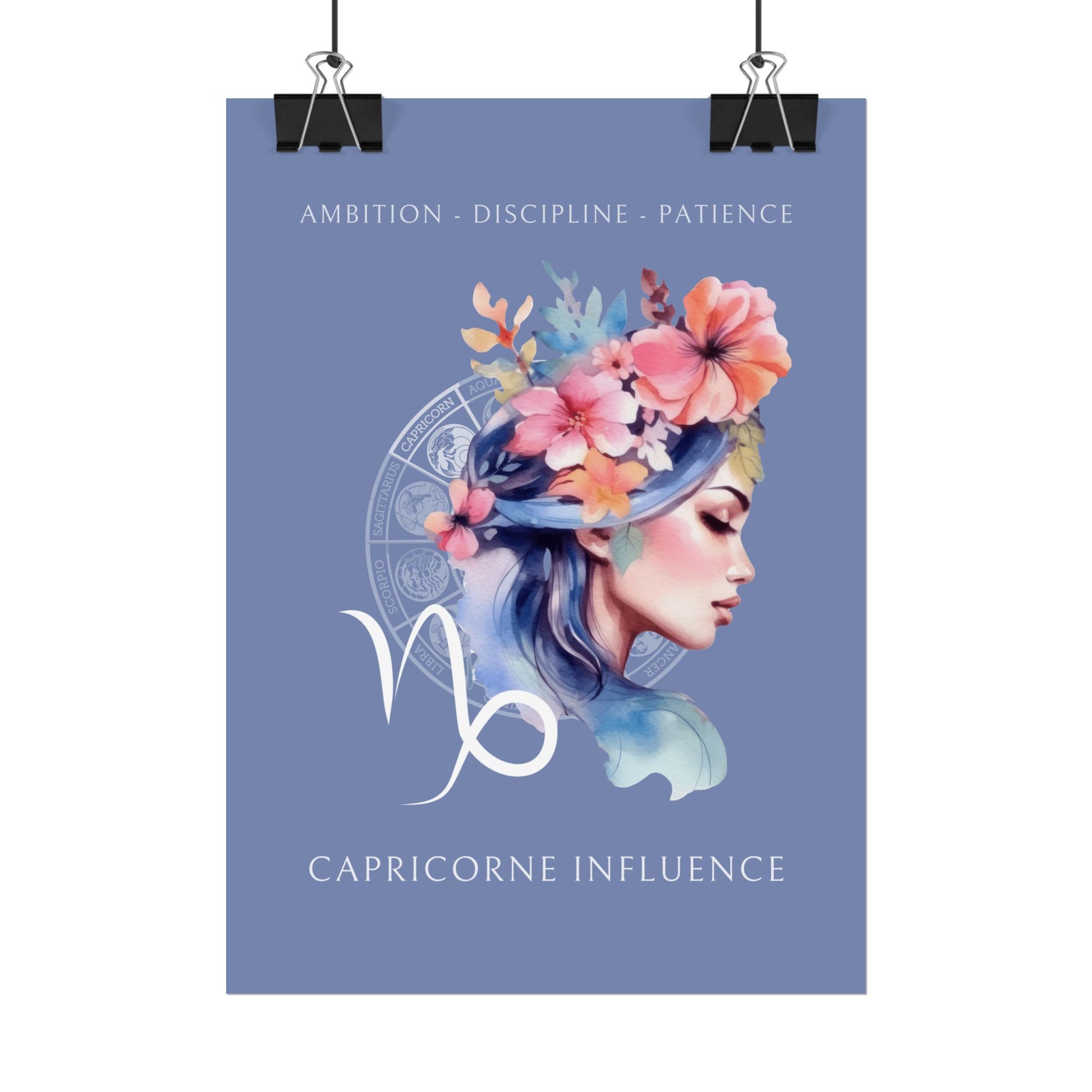 Exprimez l’ambition et la sagesse du signe du Capricorne avec ce magnifique poster, conçu pour les femmes nées sous ce signe de terre. L’illustration de Jasmine, entourée de fleurs, incarne l’essence du Capricorne tout en mettant en avant ses qualités uniques : ambition, discipline et patience.