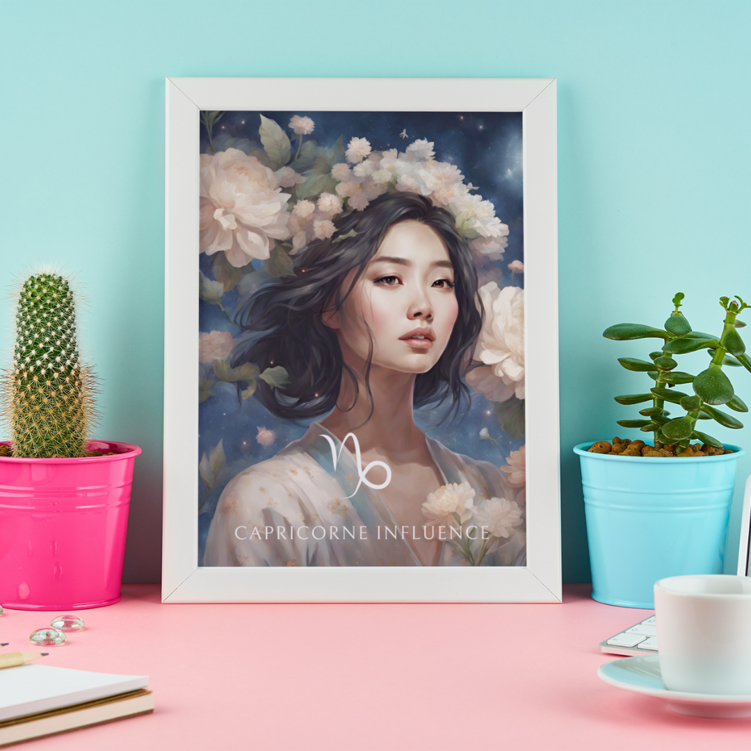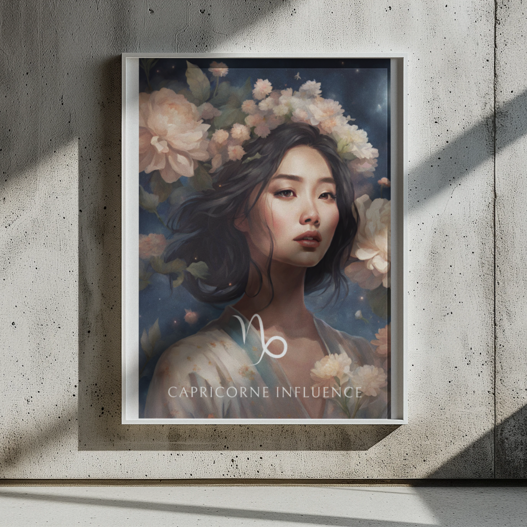 Apportez une touche d'élégance et de détermination à votre intérieur avec ce poster spécialement conçu pour les femmes nées sous le signe du Capricorne. Entourée de fleurs sous un ciel étoilé, Jiawei incarne l'essence de ce signe de terre, ambitieux et patient.