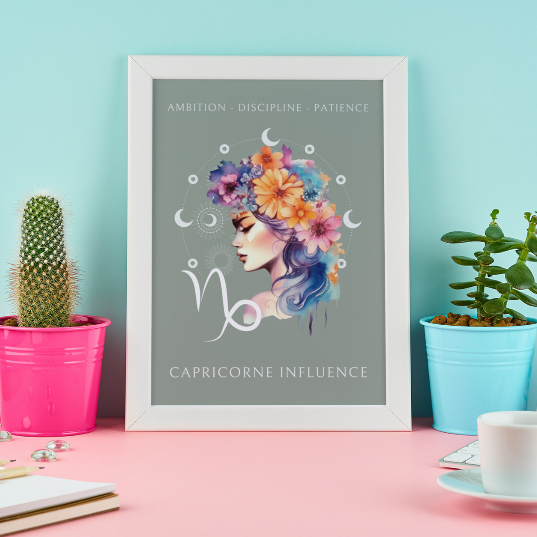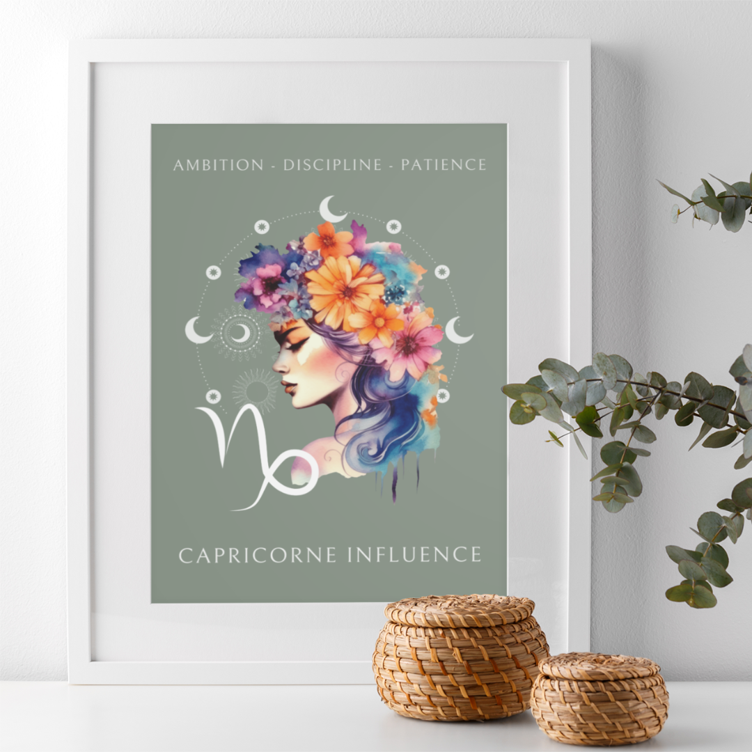 Exprimez l’ambition et la sagesse du signe du Capricorne avec ce magnifique poster, conçu pour les femmes nées sous ce signe de terre. L’illustration de Léa, entourée de fleurs, incarne l’essence du Capricorne tout en mettant en avant ses qualités uniques : ambition, discipline et patience.