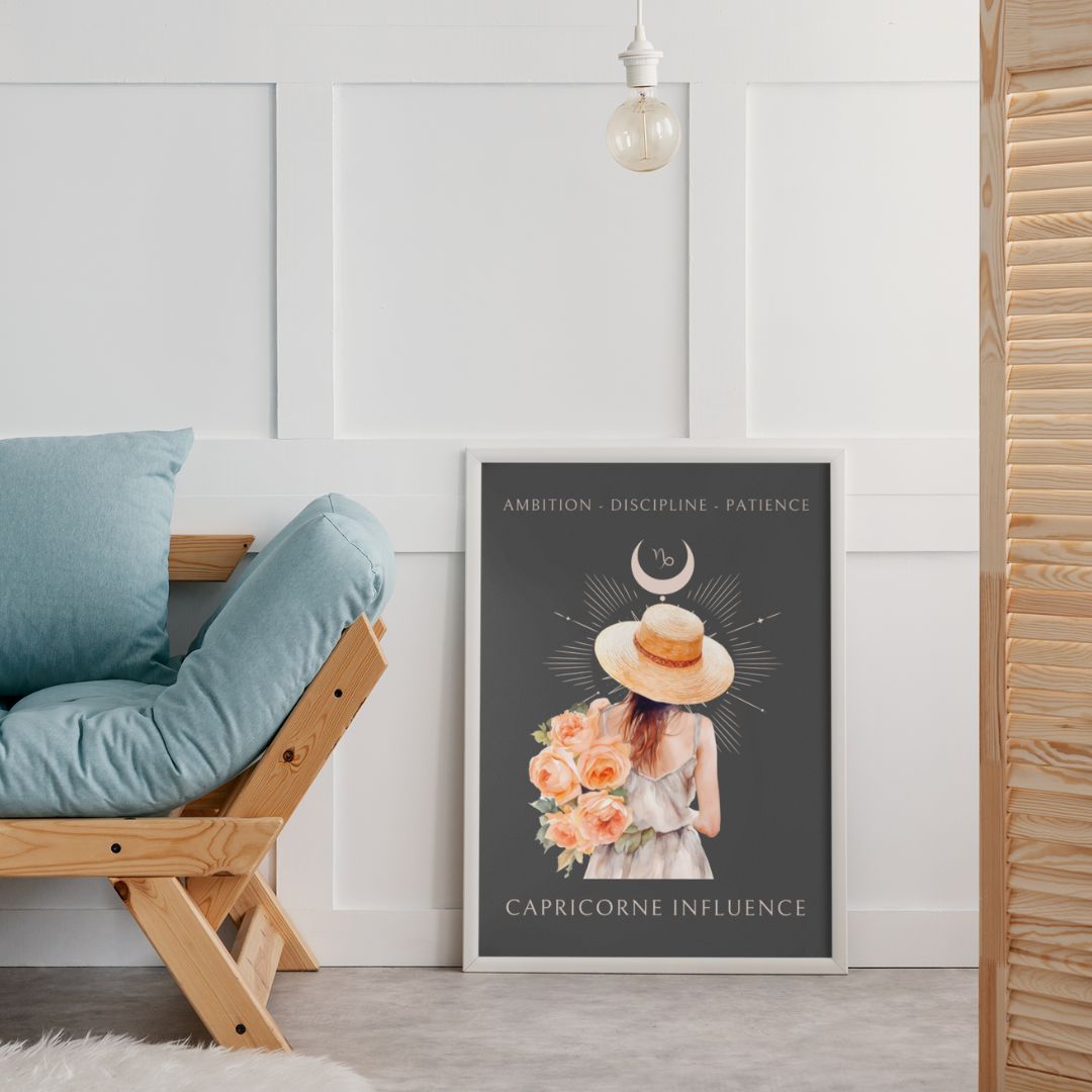 Exprimez l’ambition et la sagesse du signe du Capricorne avec ce magnifique poster, conçu pour les femmes nées sous ce signe de terre. L’illustration de Rose, entourée de fleurs, incarne l’essence du Capricorne tout en mettant en avant ses qualités uniques : ambition, discipline et patience.