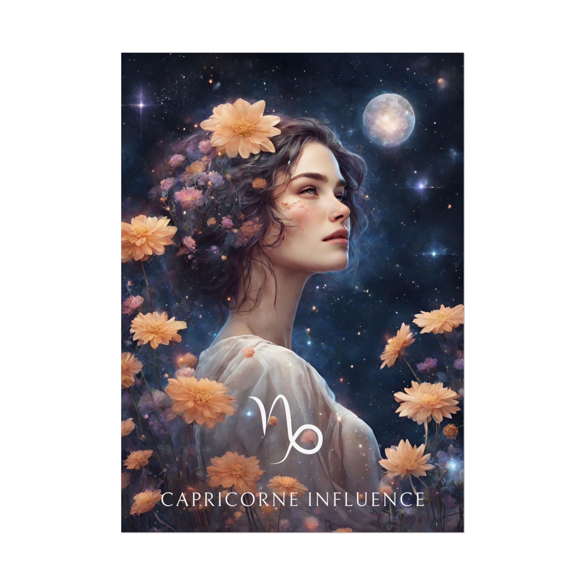 Apportez une touche d'élégance et de détermination à votre intérieur avec ce poster spécialement conçu pour les femmes nées sous le signe du Capricorne. Entourée de fleurs sous un ciel étoilé, Sophie incarne l'essence de ce signe de terre, ambitieux et patient.