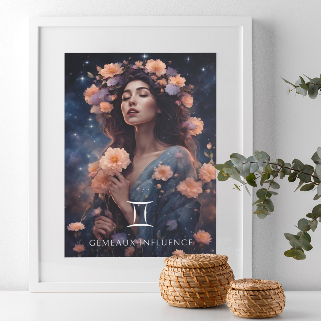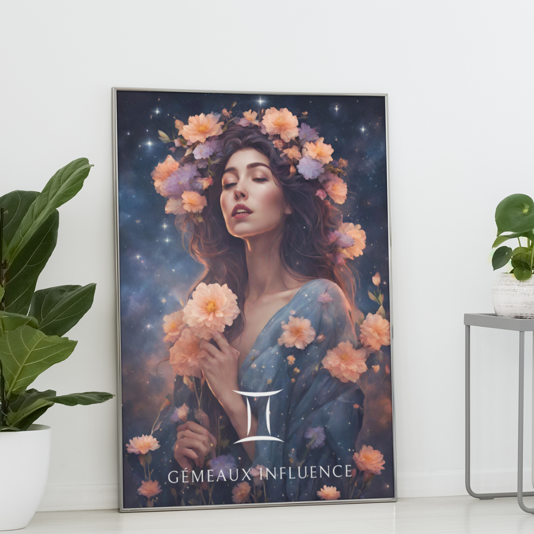 Ajoutez une touche d’éclat et de vivacité à votre espace, conçu pour les femmes nées sous le signe des Gémeaux. Entourée de fleurs et sous un ciel étoilé, Elisa capture l'essence de ce signe d'air, curieux et versatile.
