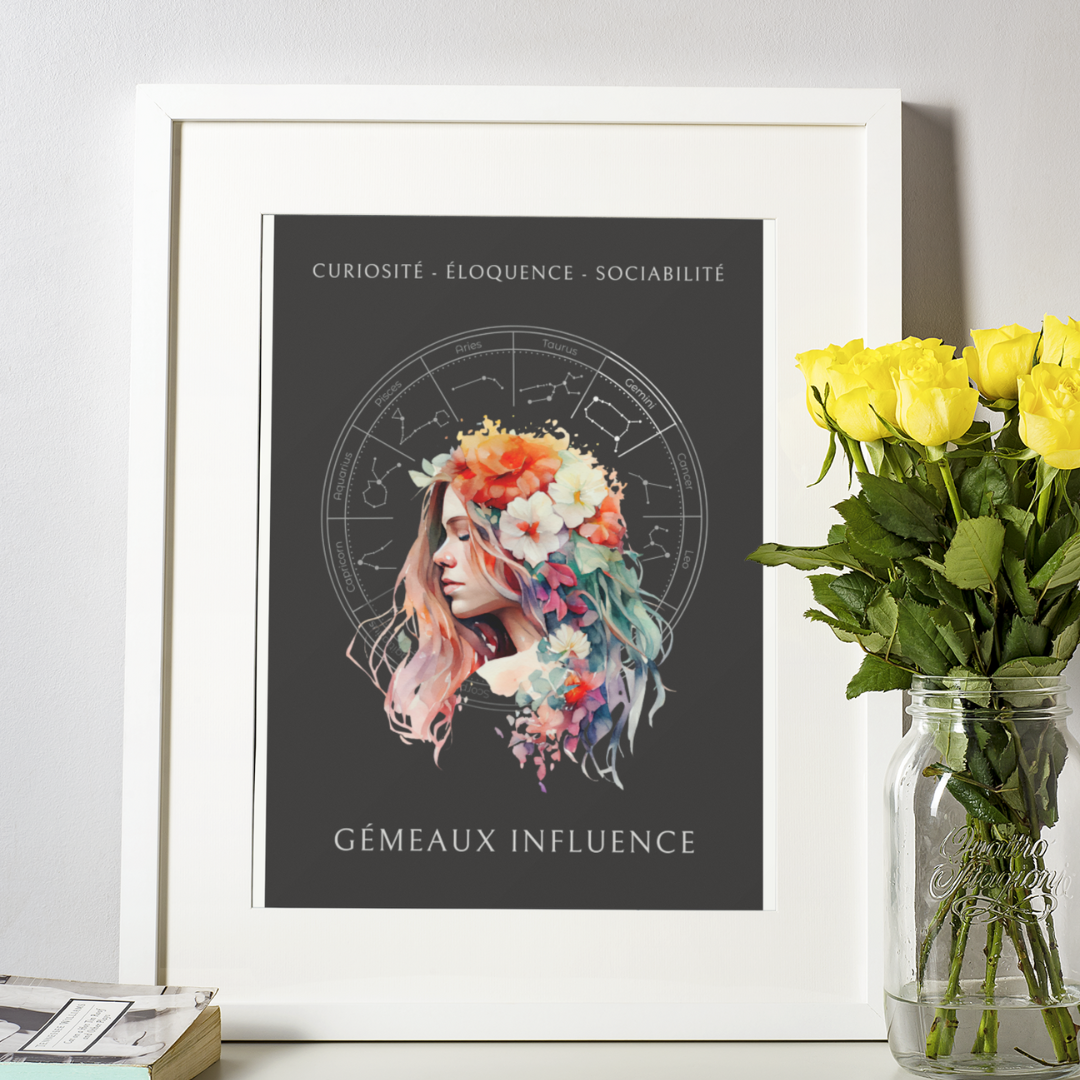Exprimez l’esprit vif et l’énergie du signe des Gémeaux avec ce magnifique poster, conçu pour les femmes nées sous ce signe d’air. L’illustration de Fanny, entourée de fleurs, capte l’essence des Gémeaux tout en mettant en avant leurs qualités uniques : curiosité, éloquence et sociabilité.