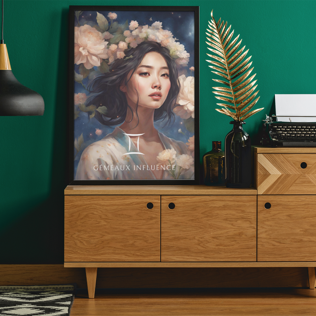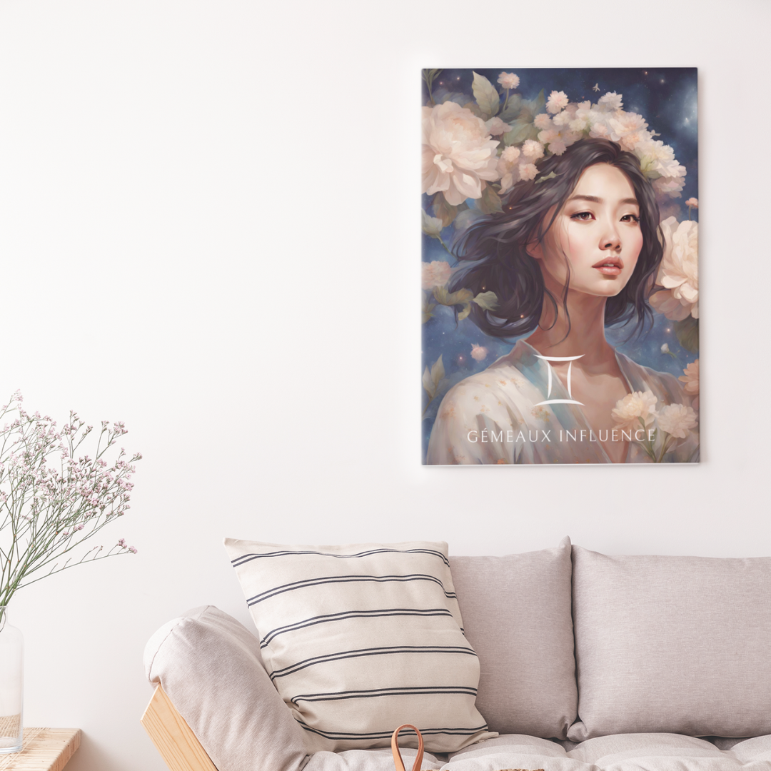 Ajoutez une touche d’éclat et de vivacité à votre espace, conçu pour les femmes nées sous le signe des Gémeaux. Entourée de fleurs et sous un ciel étoilé, Jiawei capture l'essence de ce signe d'air, curieux et versatile.