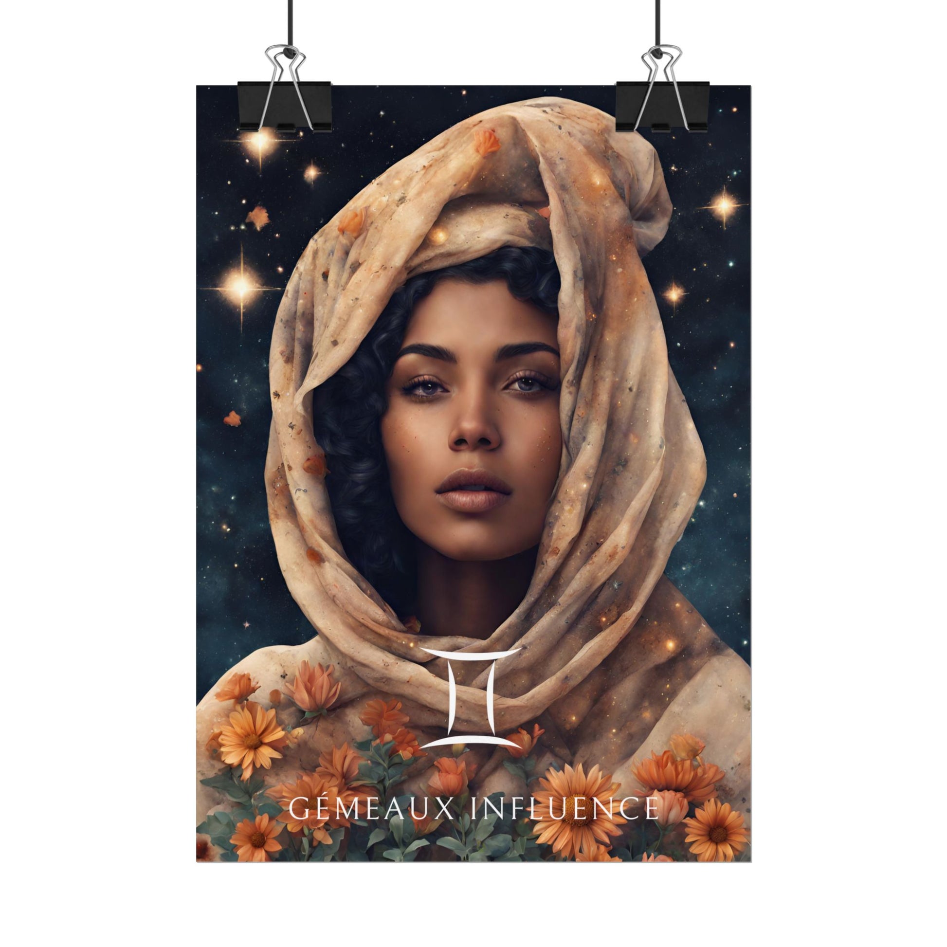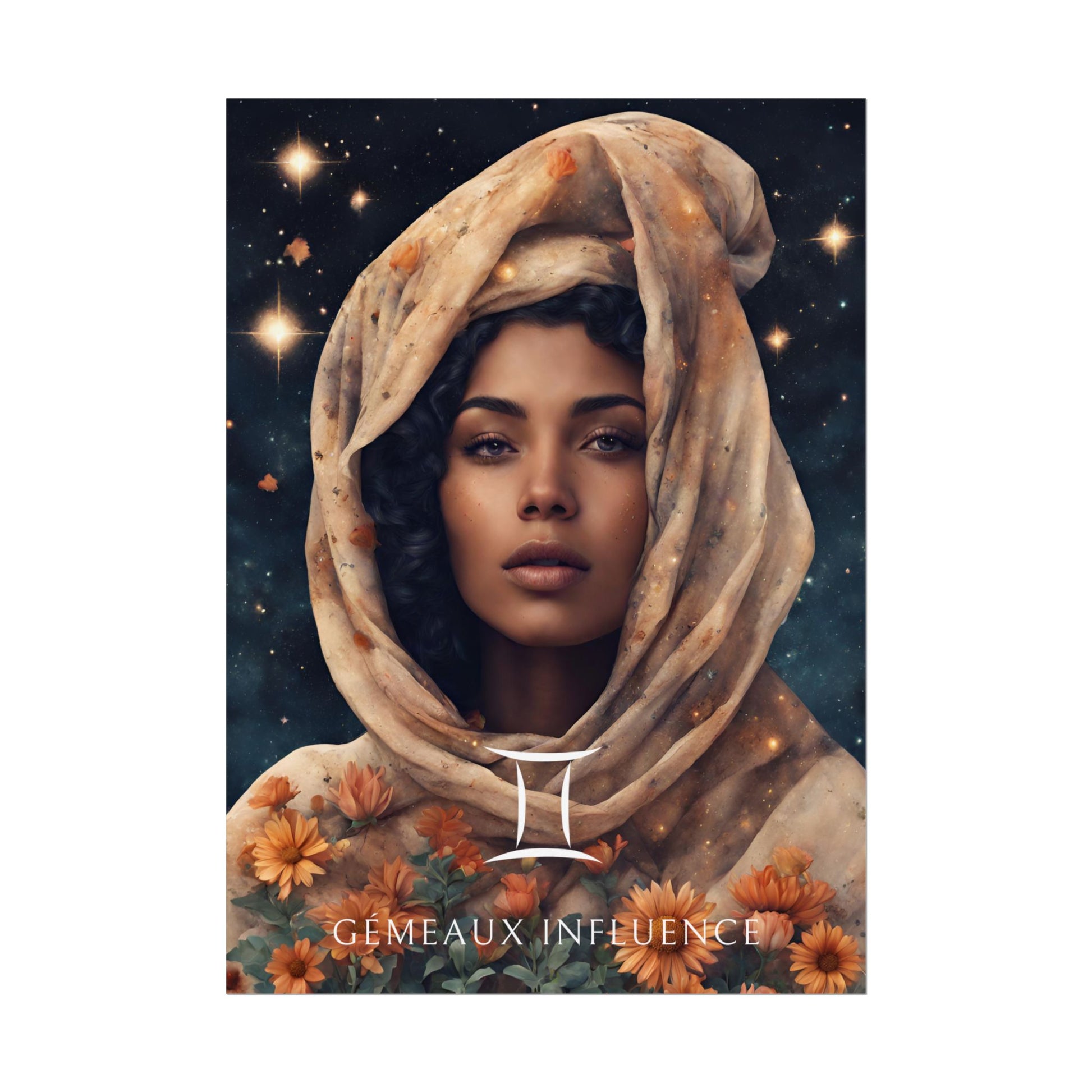 Ajoutez une touche d’éclat et de vivacité à votre espace, conçu pour les femmes nées sous le signe des Gémeaux. Entourée de fleurs et sous un ciel étoilé, Jihane capture l'essence de ce signe d'air, curieux et versatile.