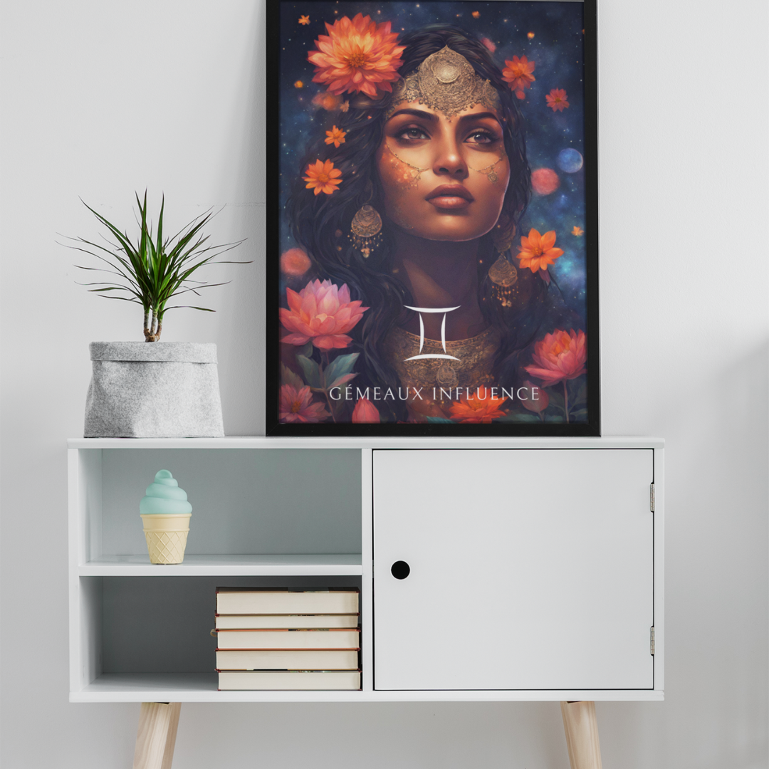 Ajoutez une touche d’éclat et de vivacité à votre espace, conçu pour les femmes nées sous le signe des Gémeaux. Entourée de fleurs et sous un ciel étoilé, Lakshmi capture l'essence de ce signe d'air, curieux et versatile.