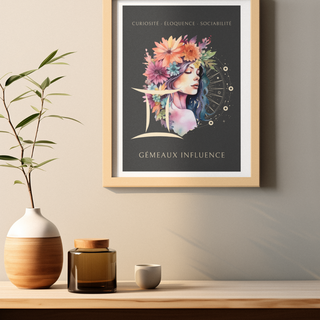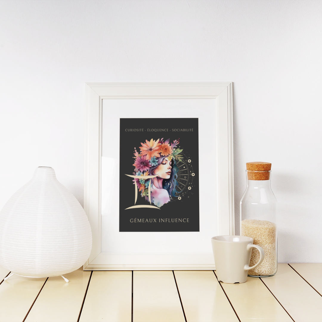 Exprimez l’esprit vif et l’énergie du signe des Gémeaux avec ce magnifique poster, conçu pour les femmes nées sous ce signe d’air. L’illustration de Mélanie, entourée de fleurs, capte l’essence des Gémeaux tout en mettant en avant leurs qualités uniques : curiosité, éloquence et sociabilité.