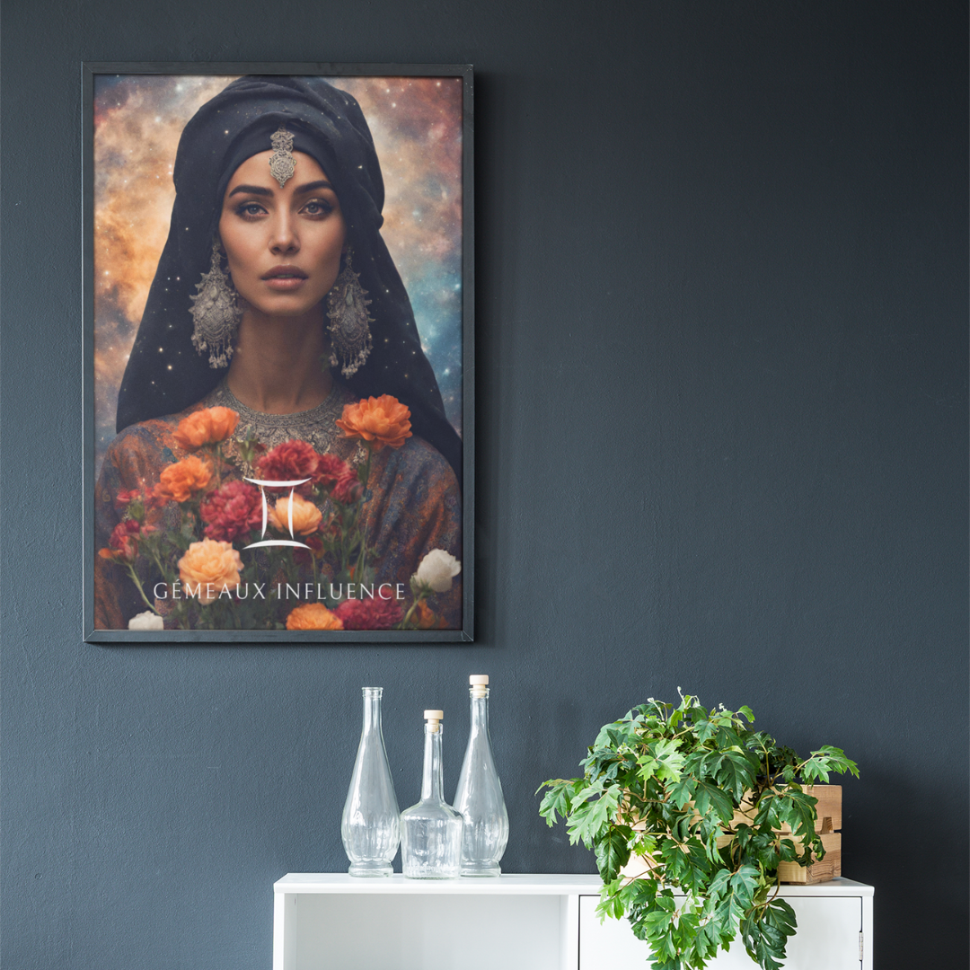 Ajoutez une touche d’éclat et de vivacité à votre espace, conçu pour les femmes nées sous le signe des Gémeaux. Entourée de fleurs et sous un ciel étoilé, Nawal capture l'essence de ce signe d'air, curieux et versatile.