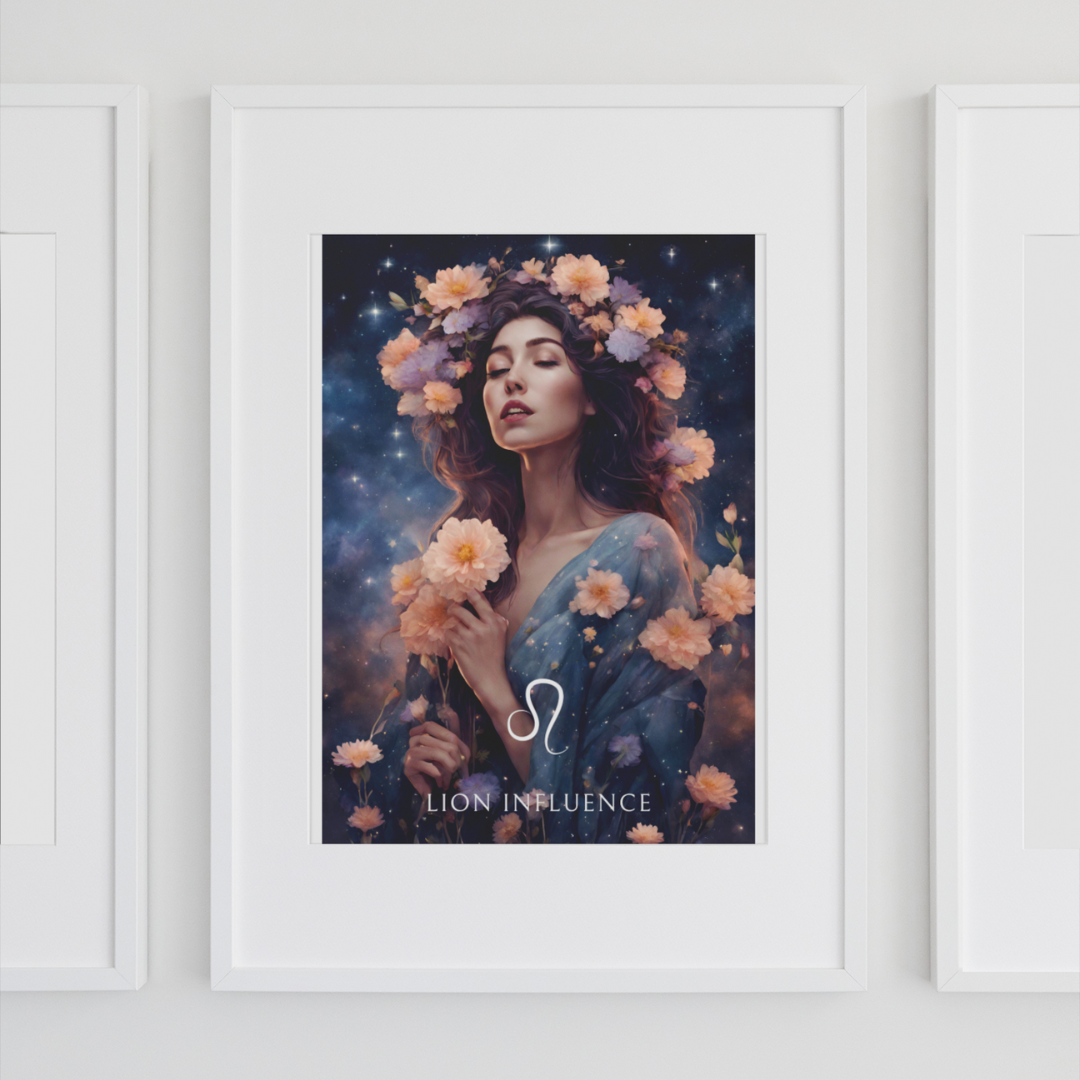 Apportez une touche de charisme et de chaleur à votre intérieur avec ce poster spécialement conçu pour les femmes nées sous le signe du Lion. Entourée de fleurs sous un ciel étoilé, Sophie incarne l'essence de ce signe de feu, rayonnant et confiant.
