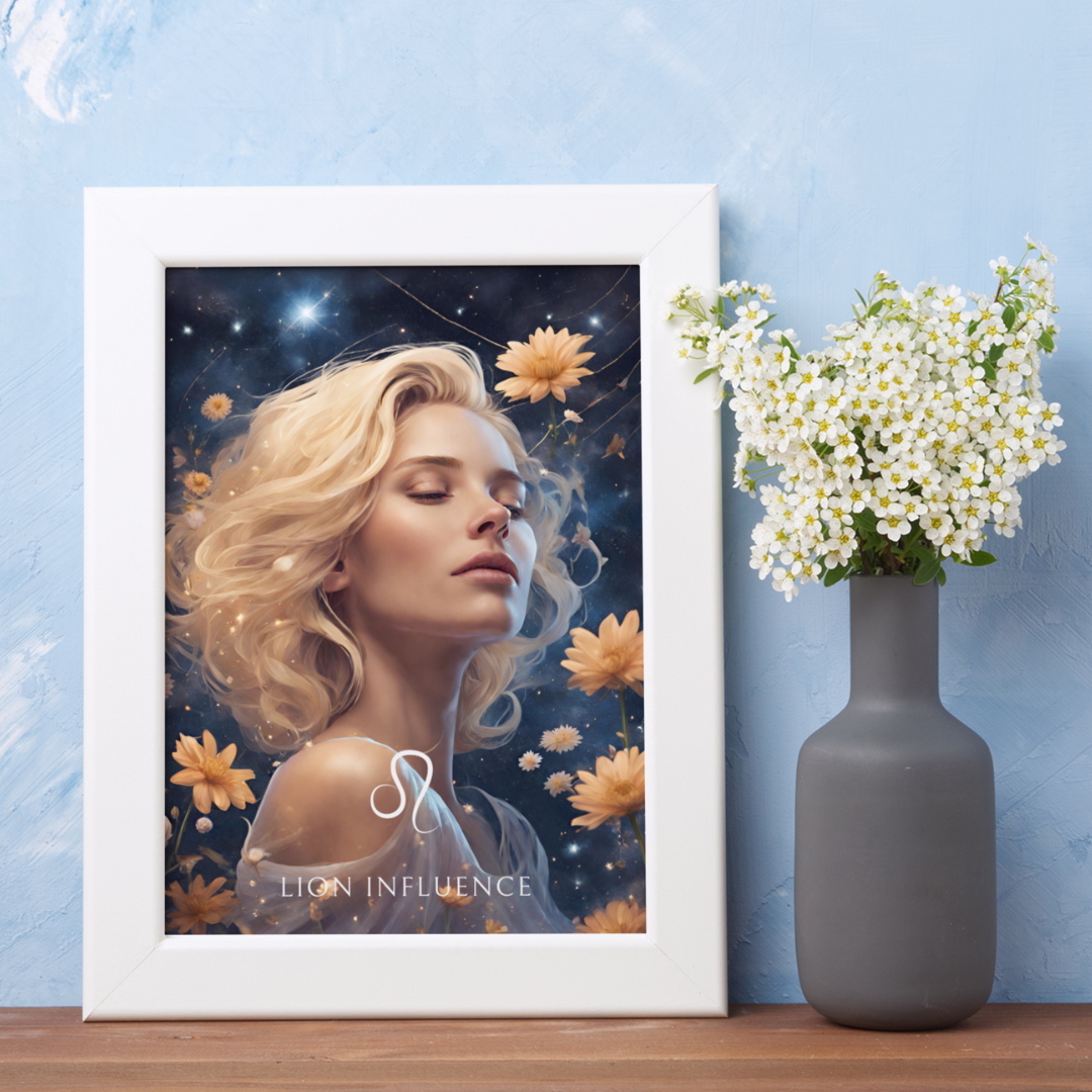 Apportez une touche de charisme et de chaleur à votre intérieur avec ce poster spécialement conçu pour les femmes nées sous le signe du Lion. Entourée de fleurs sous un ciel étoilé, Gabrielle incarne l'essence de ce signe de feu, rayonnant et confiant.