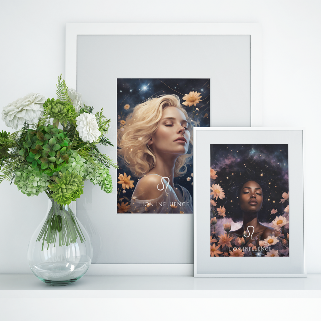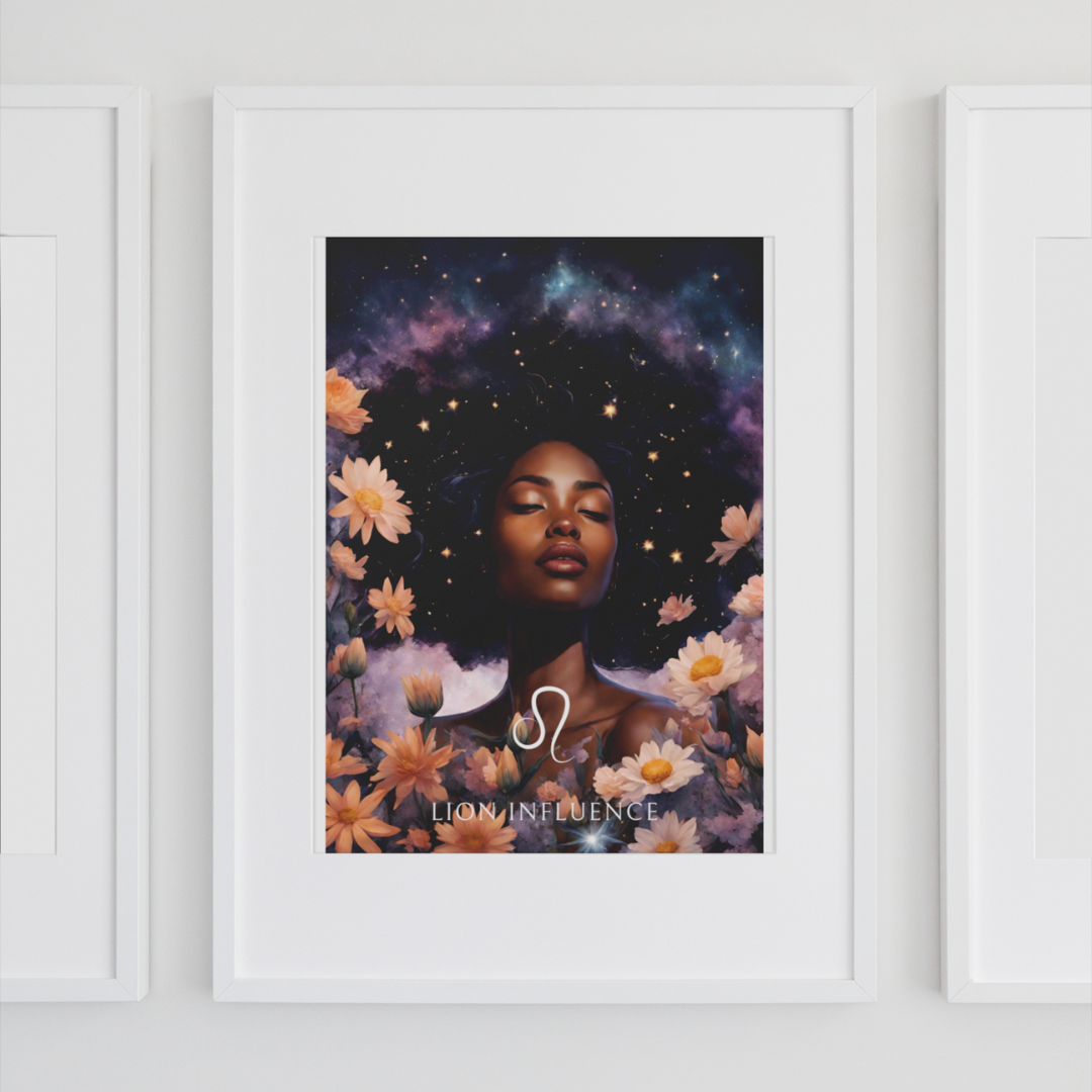 Apportez une touche de charisme et de chaleur à votre intérieur avec ce poster spécialement conçu pour les femmes nées sous le signe du Lion. Entourée de fleurs sous un ciel étoilé, Imani incarne l'essence de ce signe de feu, rayonnant et confiant.