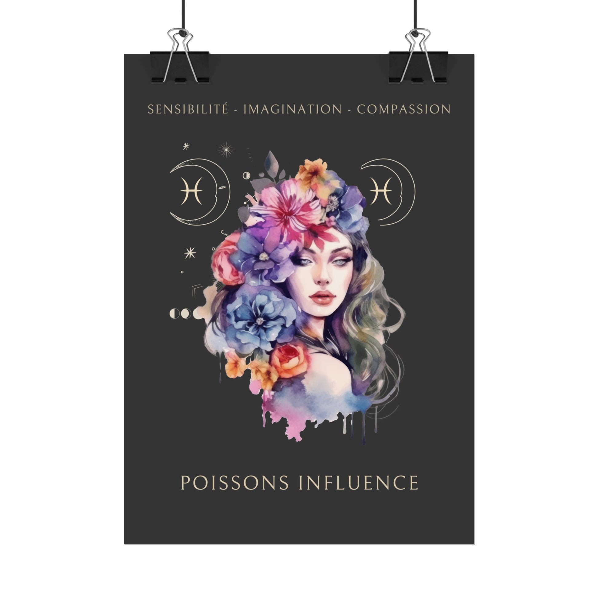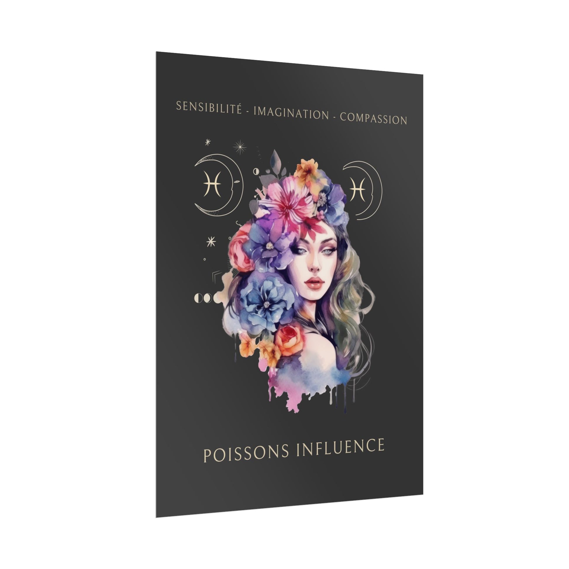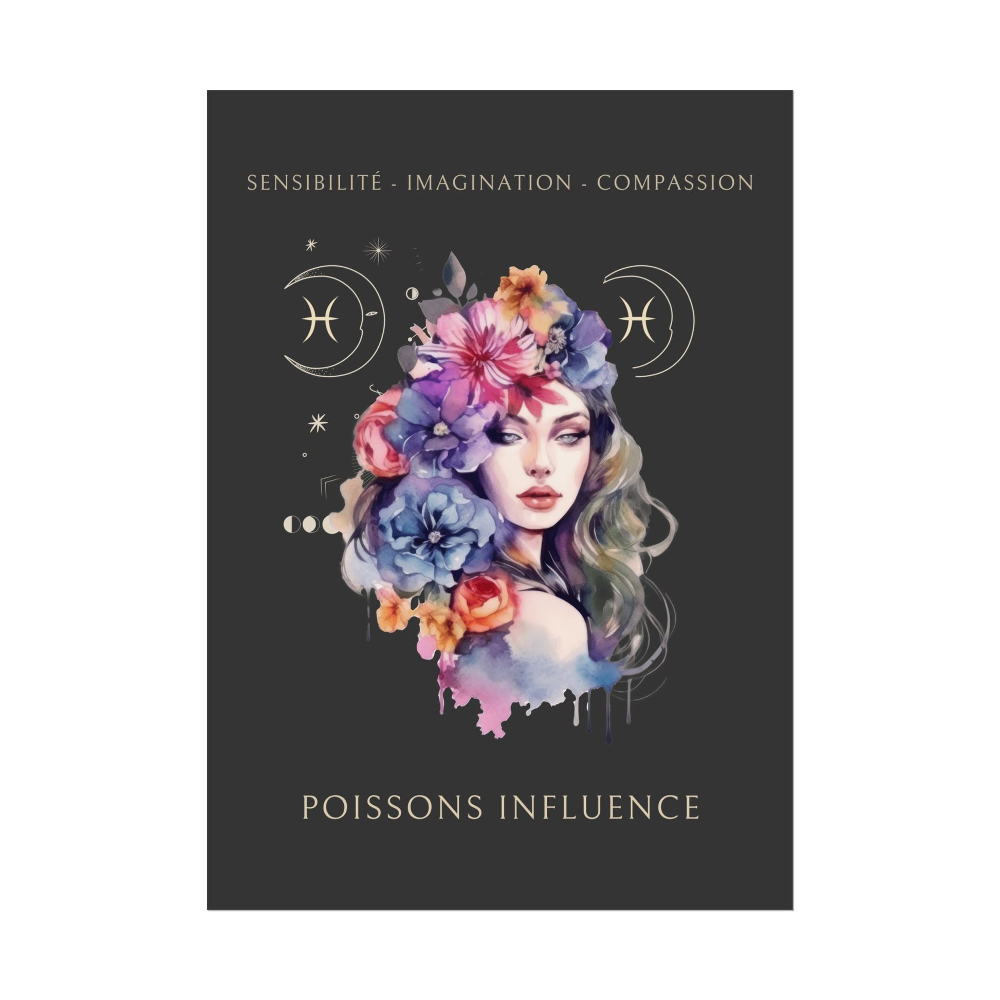 Exprimez la sensibilité et la créativité du signe des Poissons avec ce magnifique poster, conçu pour les femmes nées sous ce signe d'eau. L’illustration d'Eleonore, entourée de fleurs, incarne l’essence des Poissons tout en mettant en avant ses qualités uniques : sensibilité, imagination et compassion.