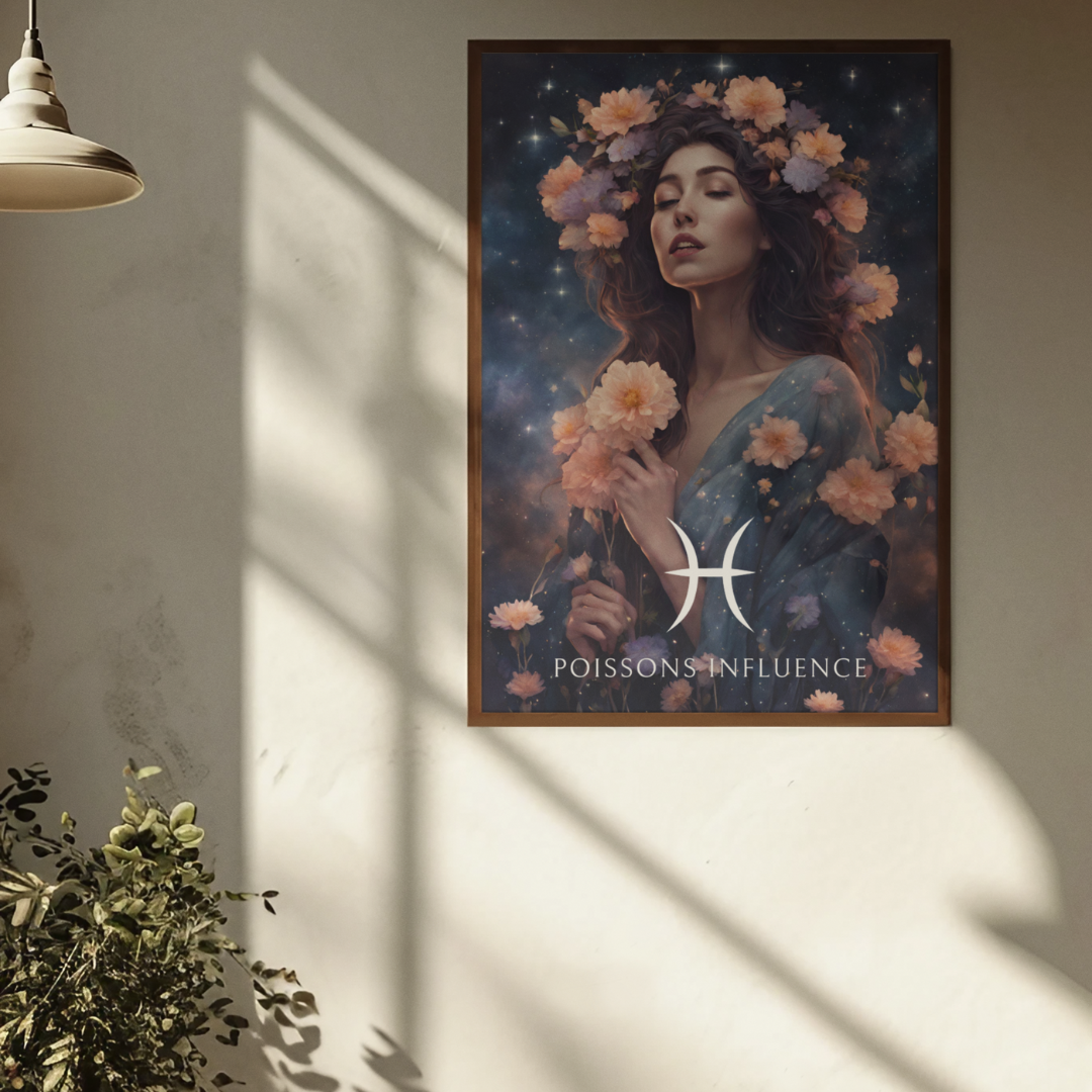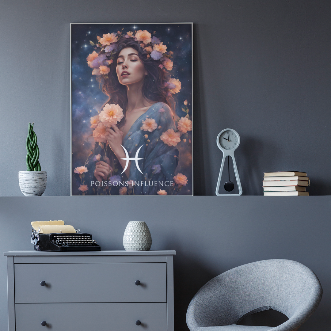 Apportez une atmosphère douce et rêveuse à votre intérieur avec ce poster spécialement conçu pour les femmes nées sous le signe des Poissons. Entourée de fleurs sous un ciel étoilé, Elisa incarne l'essence de ce signe d'eau, sensible et créatif.