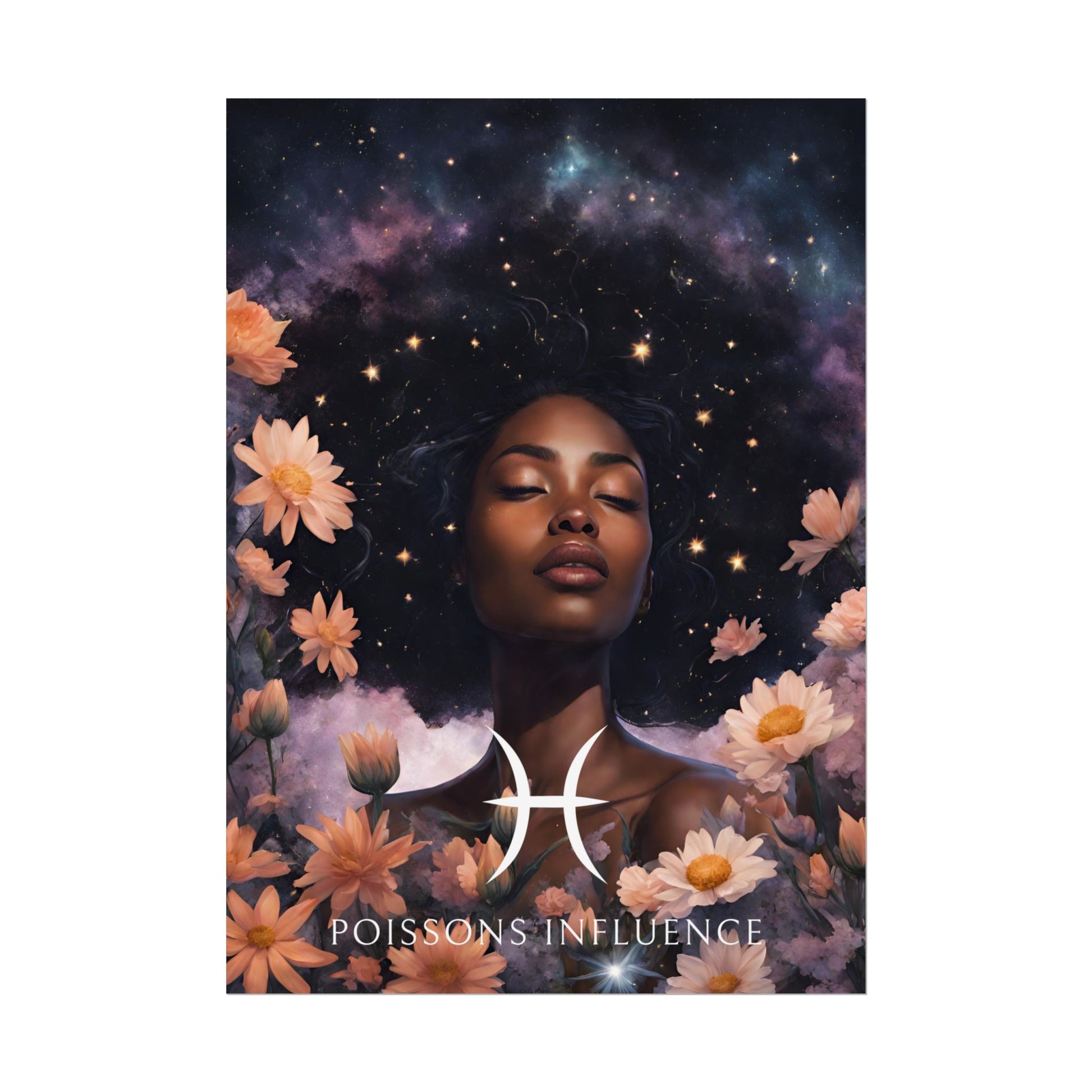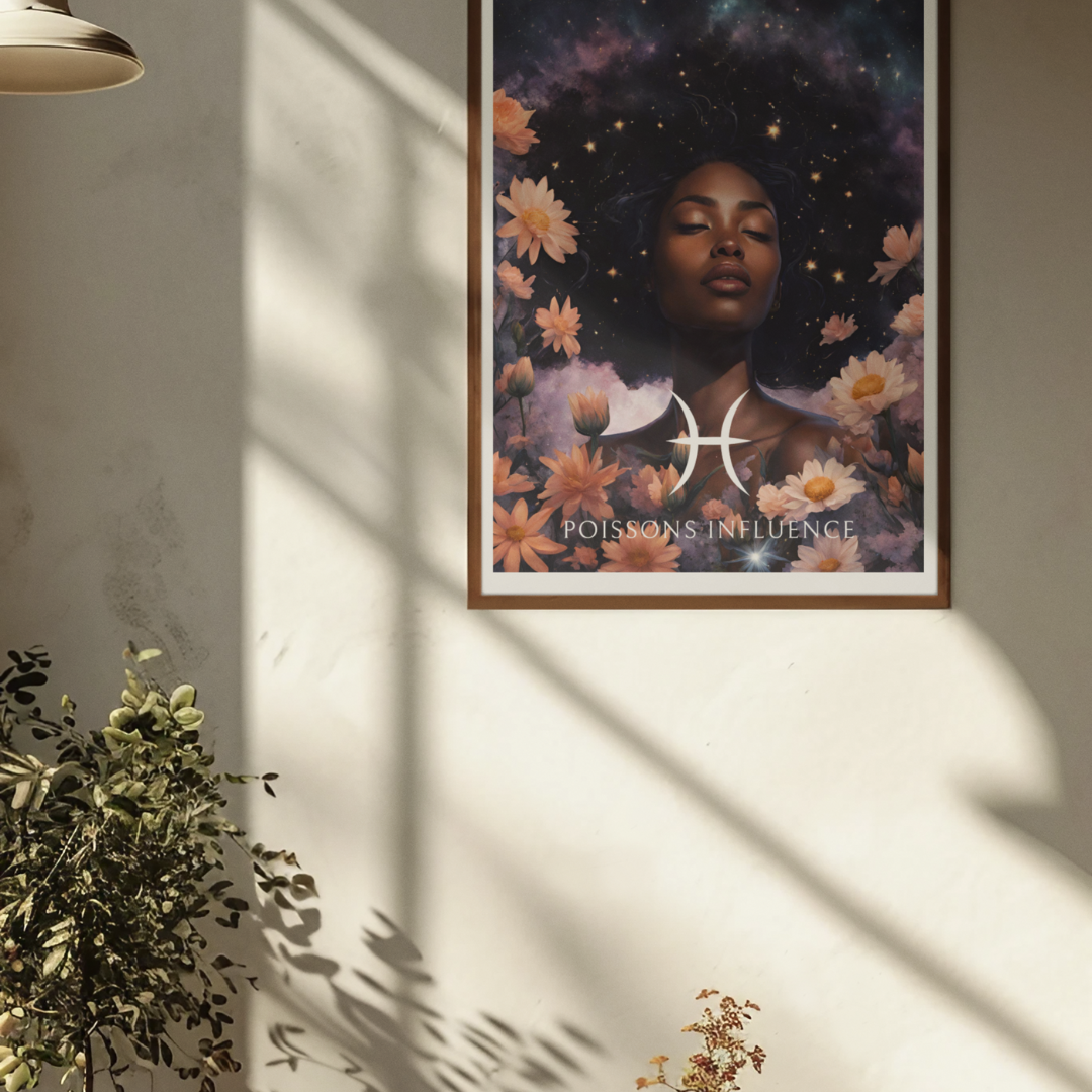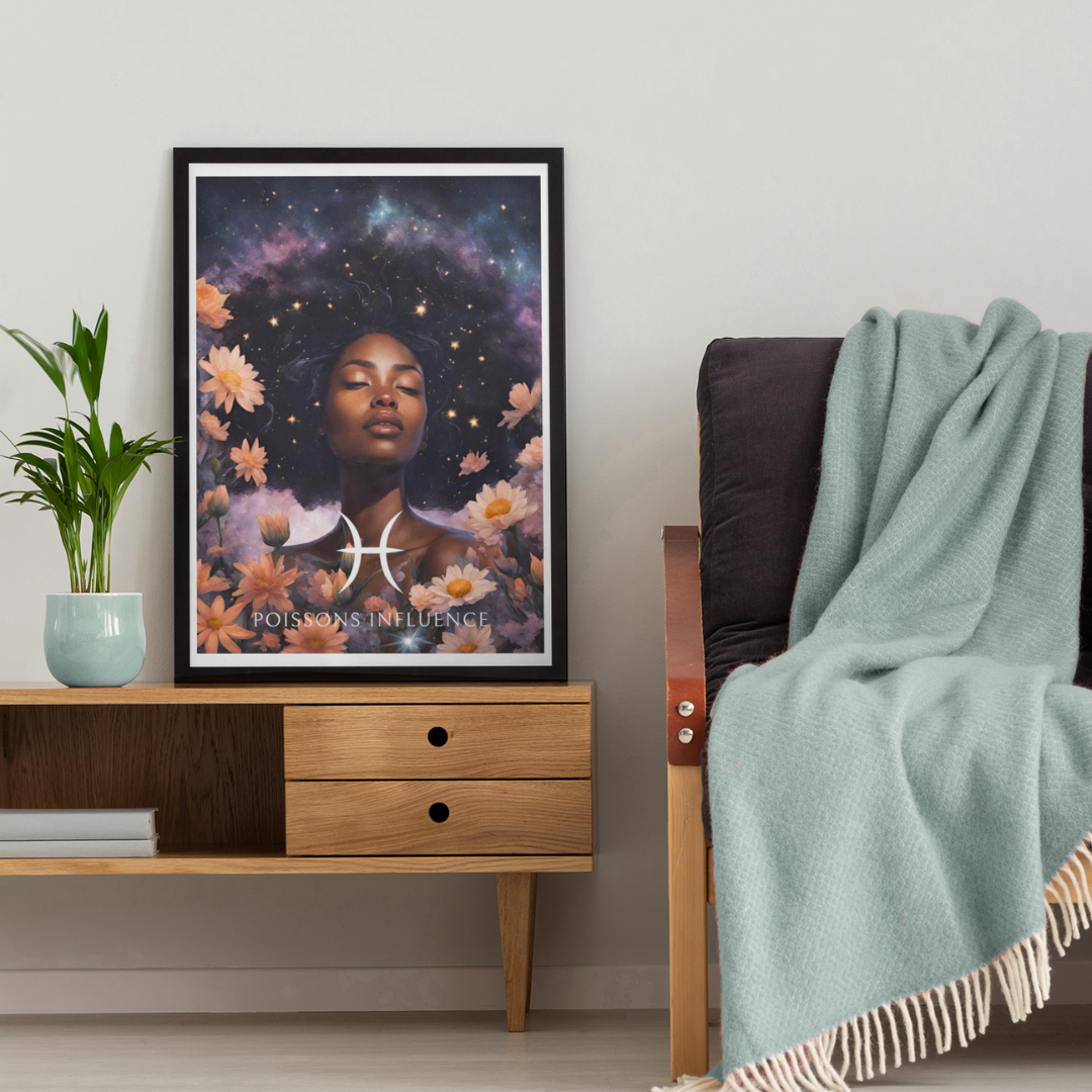 Apportez une atmosphère douce et rêveuse à votre intérieur avec ce poster spécialement conçu pour les femmes nées sous le signe des Poissons. Entourée de fleurs sous un ciel étoilé, Imani incarne l'essence de ce signe d'eau, sensible et créatif.