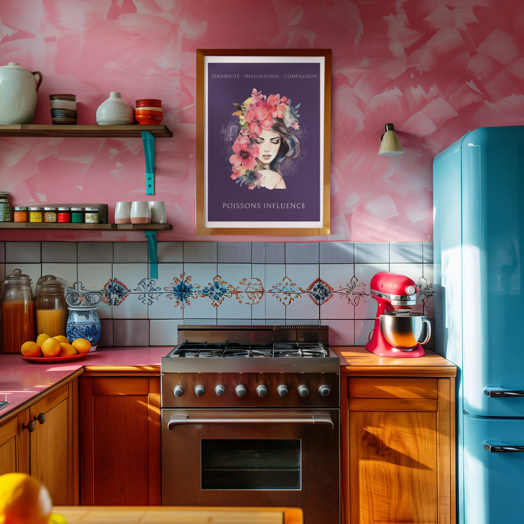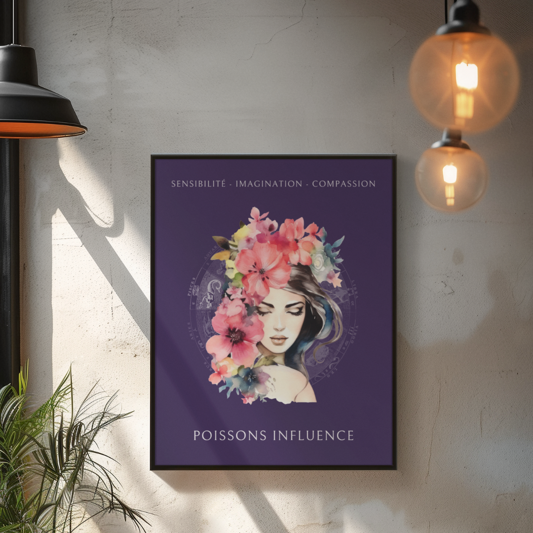 Exprimez la sensibilité et la créativité du signe des Poissons avec ce magnifique poster, conçu pour les femmes nées sous ce signe d'eau. L’illustration d'Iris, entourée de fleurs, incarne l’essence des Poissons tout en mettant en avant ses qualités uniques : sensibilité, imagination et compassion.