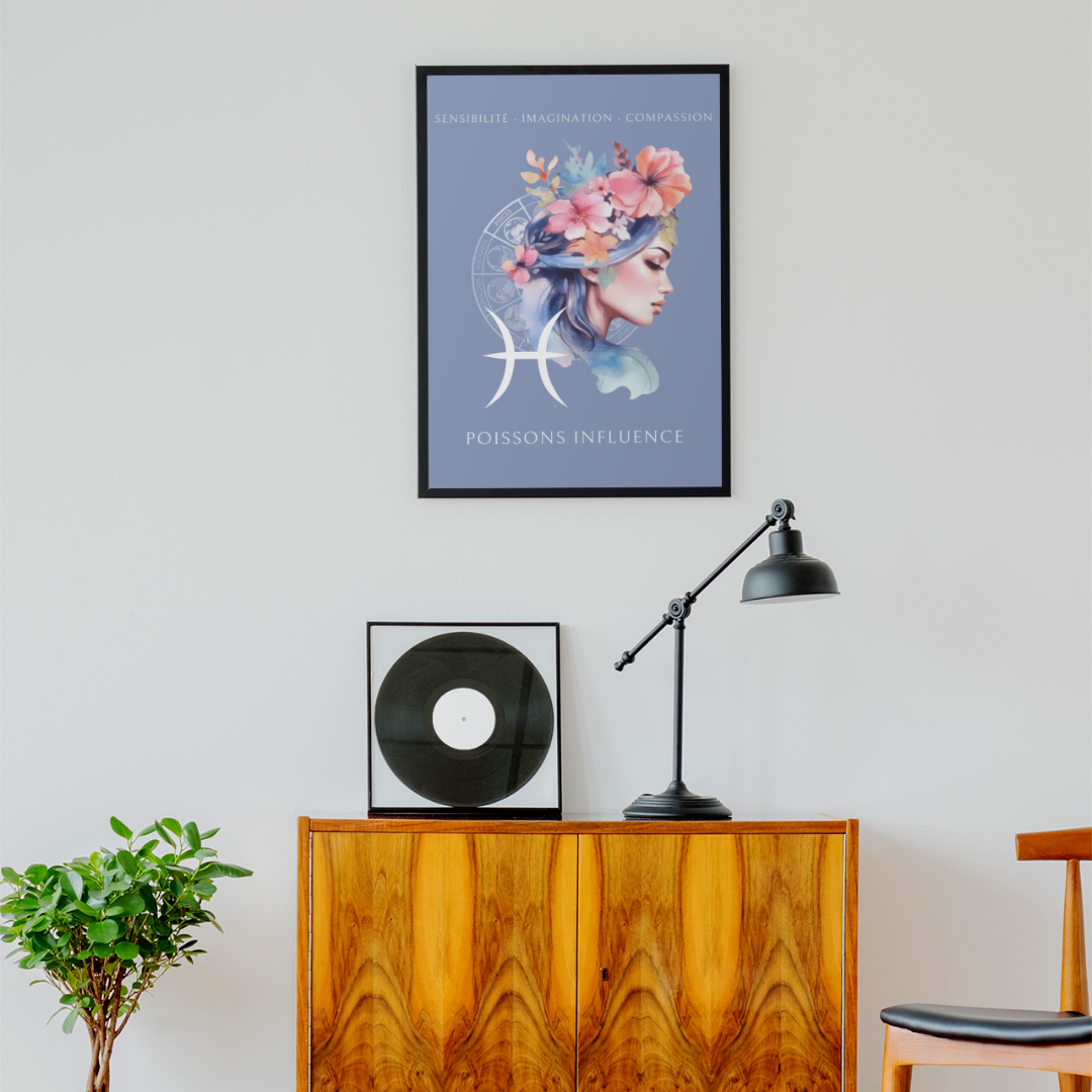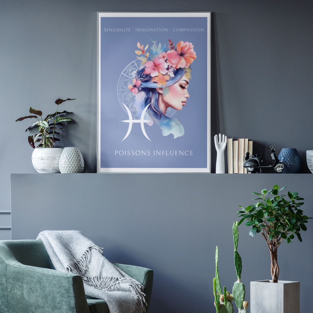 Exprimez la sensibilité et la créativité du signe des Poissons avec ce magnifique poster, conçu pour les femmes nées sous ce signe d'eau. L’illustration de Jasmine, entourée de fleurs, incarne l’essence des Poissons tout en mettant en avant ses qualités uniques : sensibilité, imagination et compassion.
