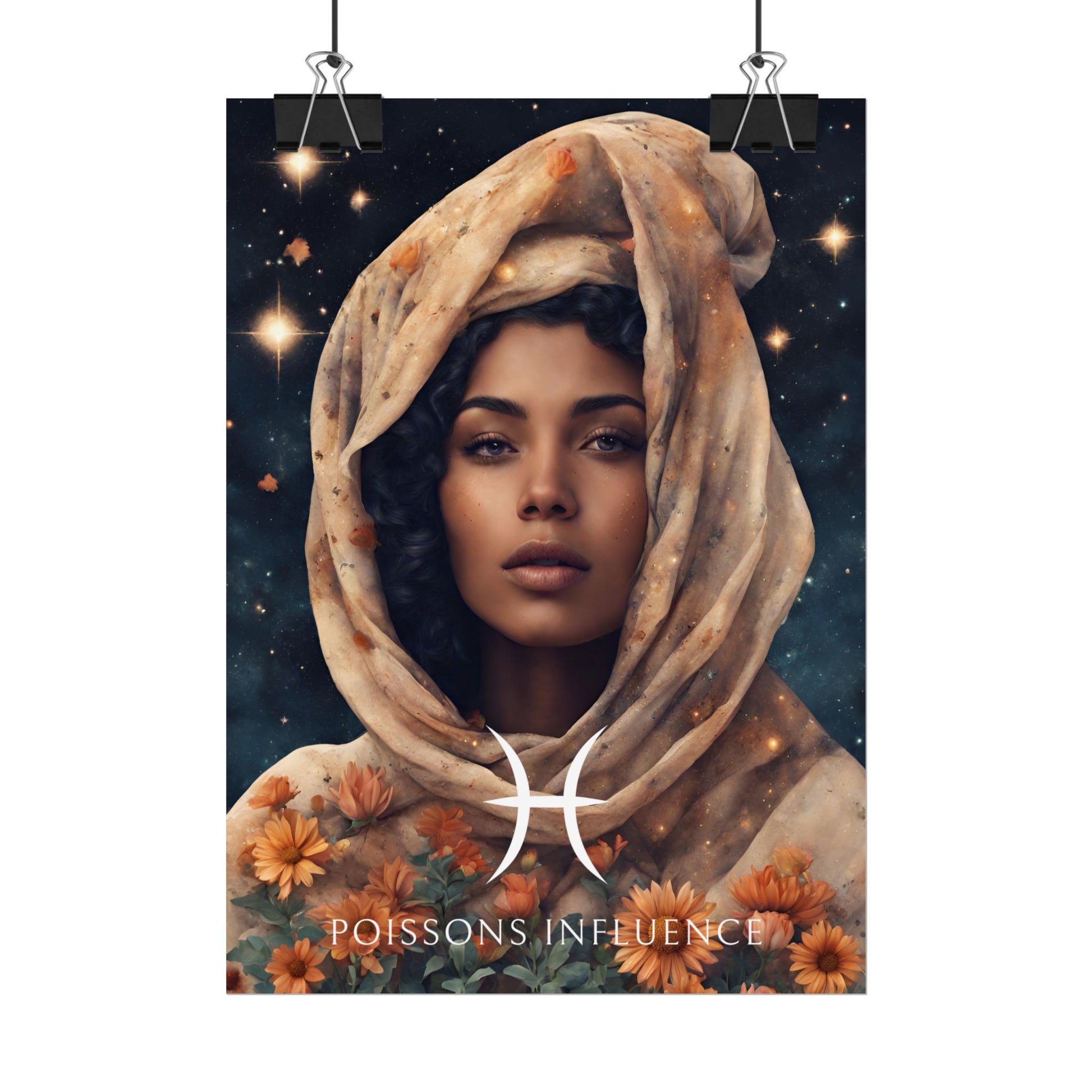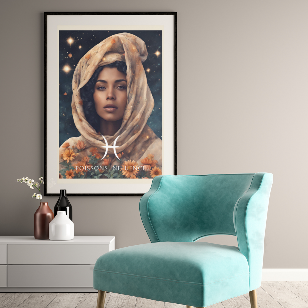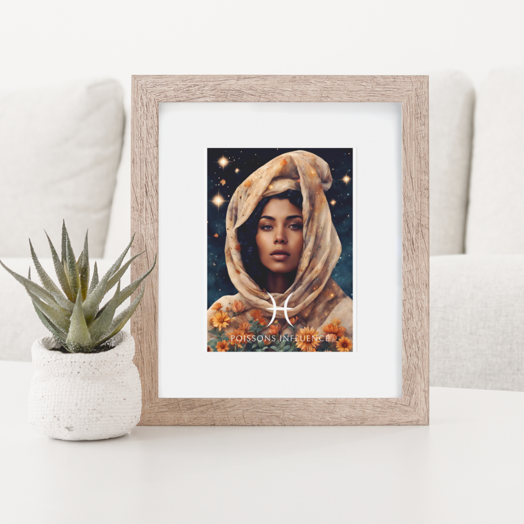 Apportez une atmosphère douce et rêveuse à votre intérieur avec ce poster spécialement conçu pour les femmes nées sous le signe des Poissons. Entourée de fleurs sous un ciel étoilé, Jihane incarne l'essence de ce signe d'eau, sensible et créatif.