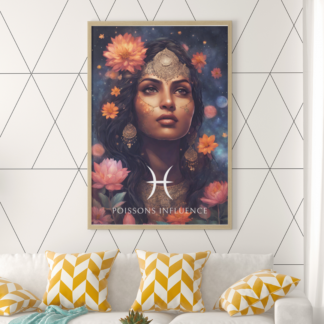 Apportez une atmosphère douce et rêveuse à votre intérieur avec ce poster spécialement conçu pour les femmes nées sous le signe des Poissons. Entourée de fleurs sous un ciel étoilé, Lakshmi incarne l'essence de ce signe d'eau, sensible et créatif.