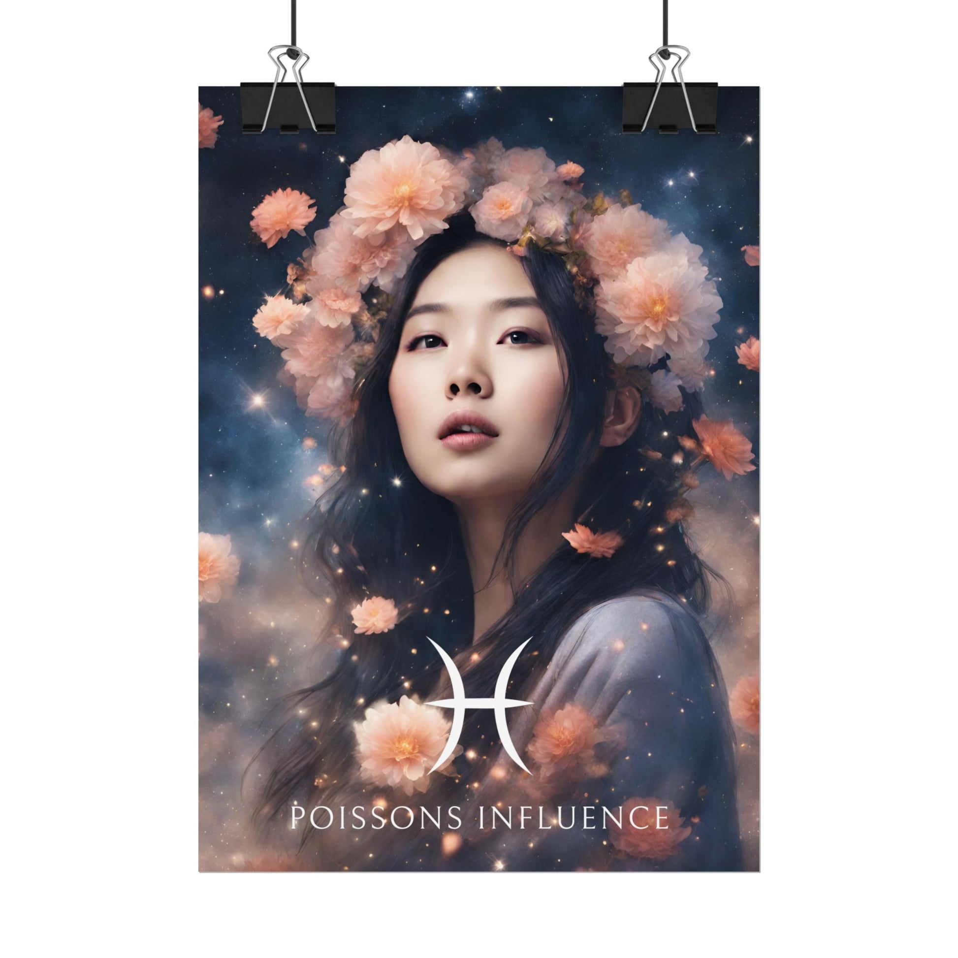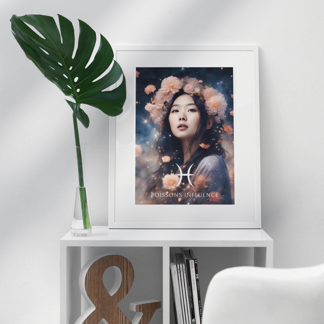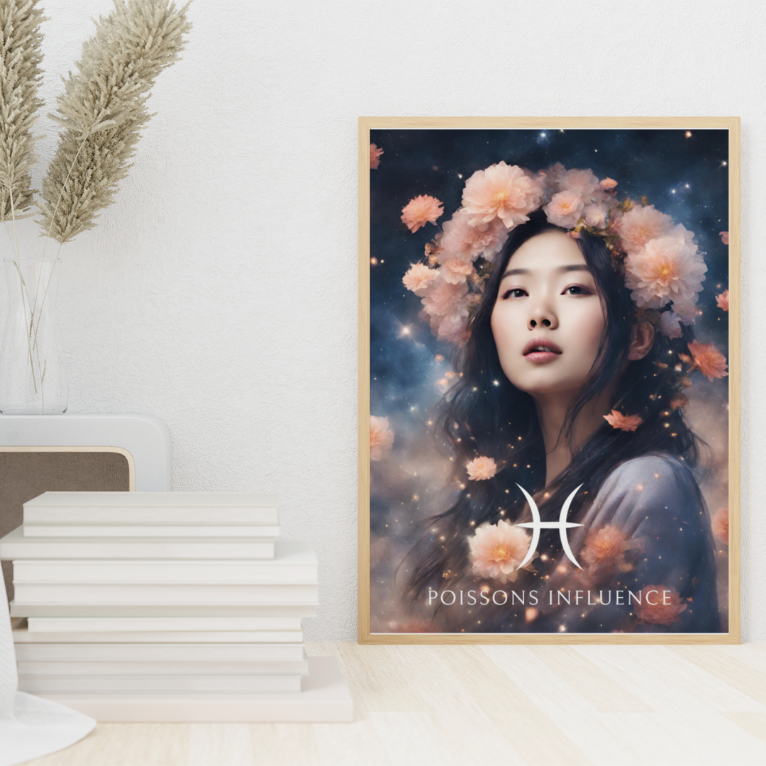 Apportez une atmosphère douce et rêveuse à votre intérieur avec ce poster spécialement conçu pour les femmes nées sous le signe des Poissons. Entourée de fleurs sous un ciel étoilé, Meiying incarne l'essence de ce signe d'eau, sensible et créatif.