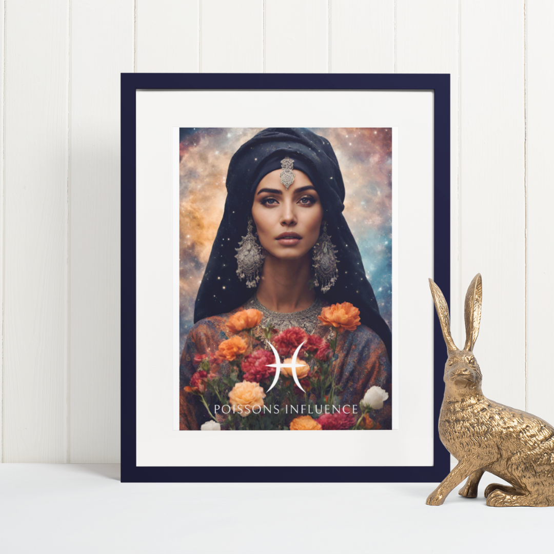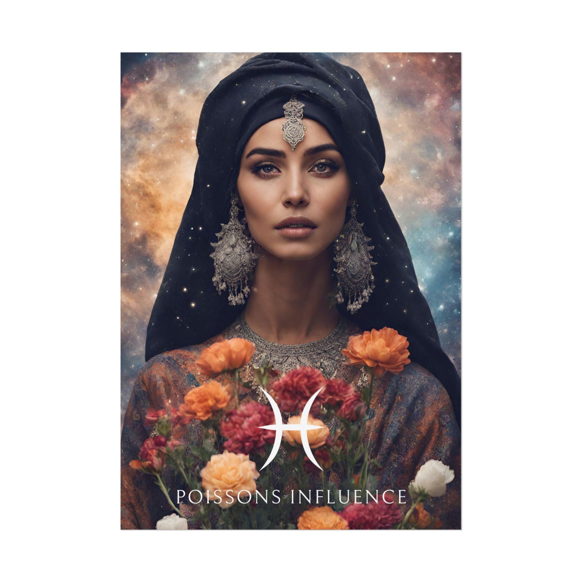 Apportez une atmosphère douce et rêveuse à votre intérieur avec ce poster spécialement conçu pour les femmes nées sous le signe des Poissons. Entourée de fleurs sous un ciel étoilé, Nawal incarne l'essence de ce signe d'eau, sensible et créatif.