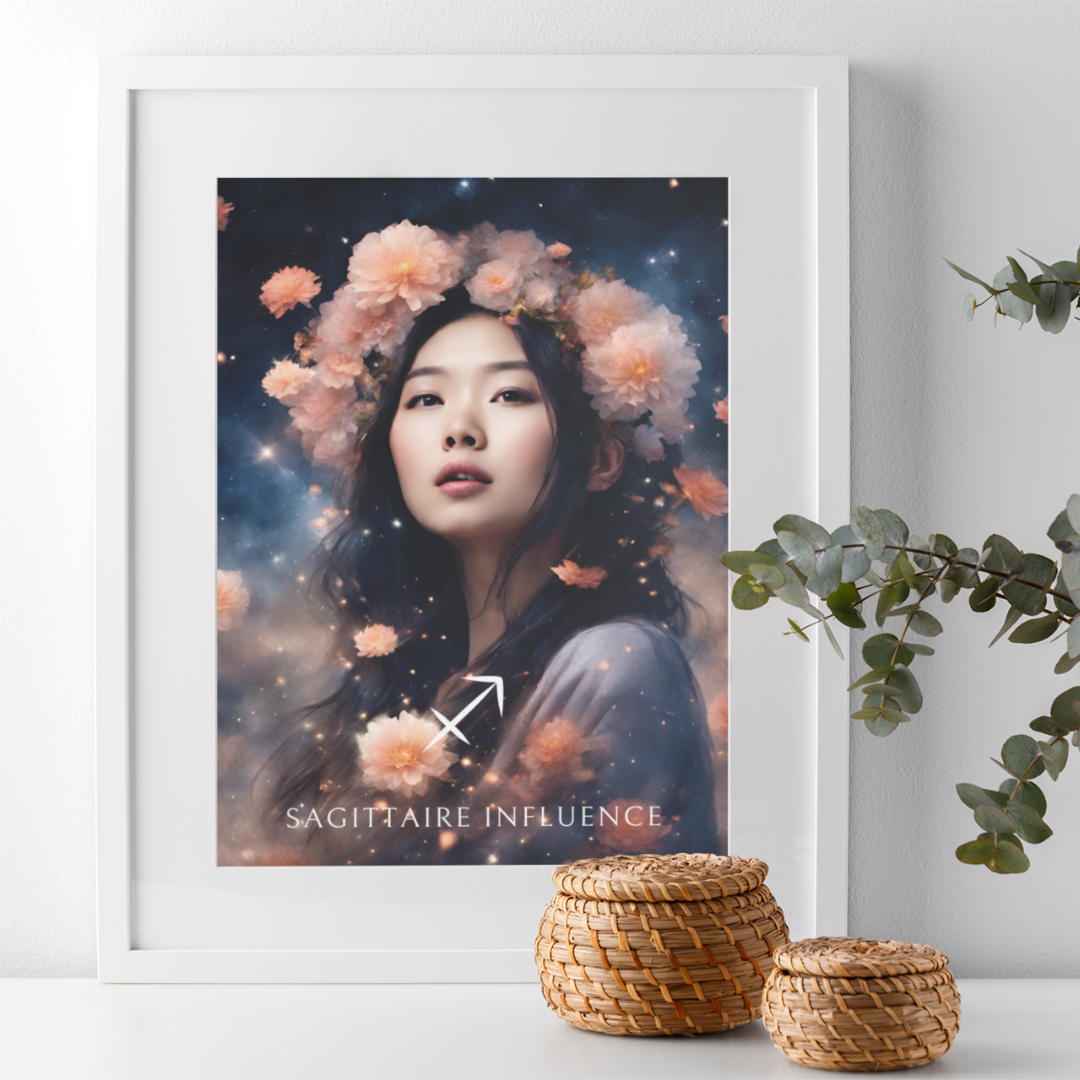 Apportez une touche d'optimisme et d'aventure à votre intérieur avec ce poster spécialement conçu pour les femmes nées sous le signe du Sagittaire. Entourée de fleurs sous un ciel étoilé, Meiying incarne l'essence de ce signe de feu, libre et audacieux.