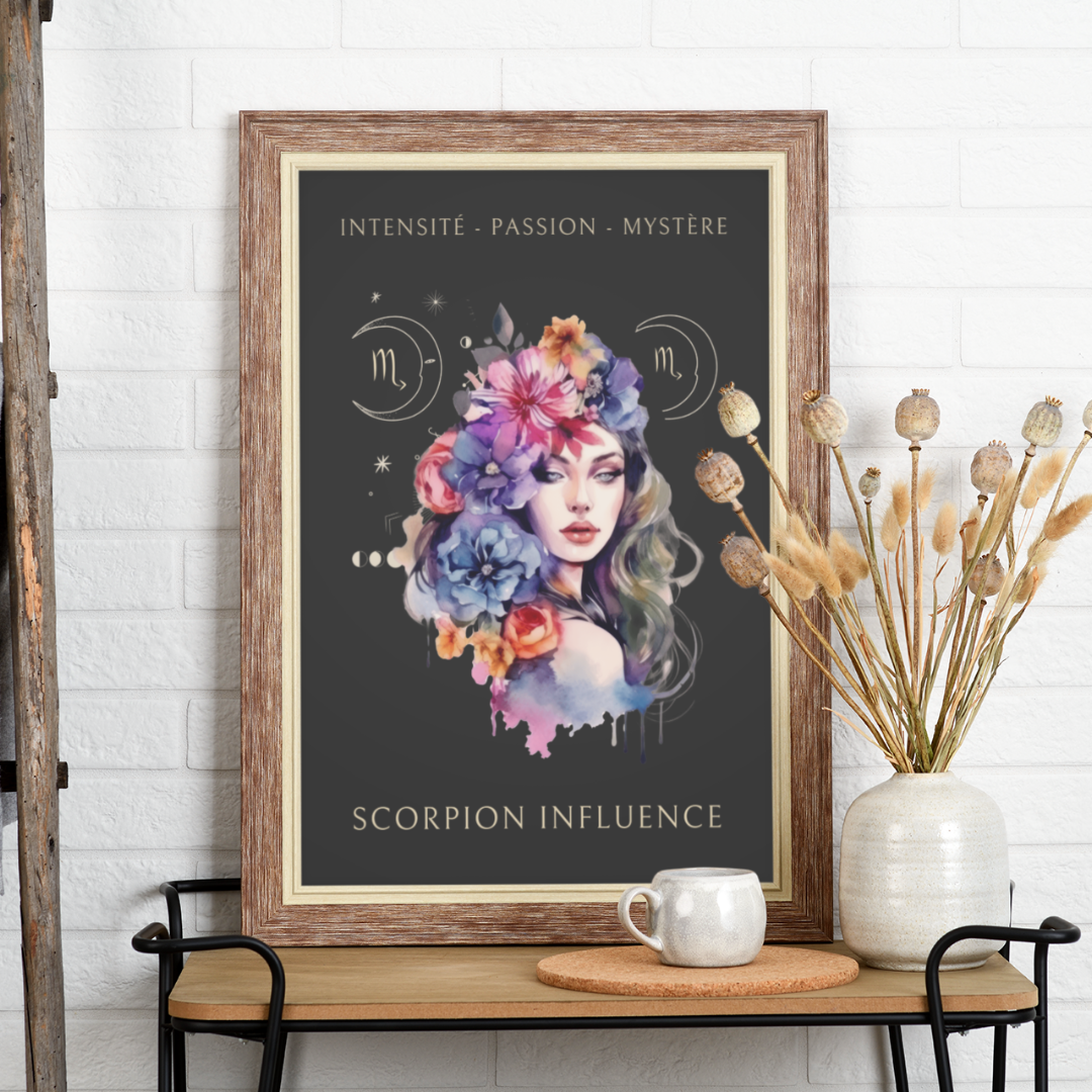 Exprimez l'intensité et la profondeur du signe du Scorpion avec ce magnifique poster, conçu pour les femmes nées sous ce signe d'eau. L’illustration d'Eleonore, entourée de fleurs, capture l’essence du Scorpion tout en mettant en avant ses qualités uniques : intensité, passion et mystère.