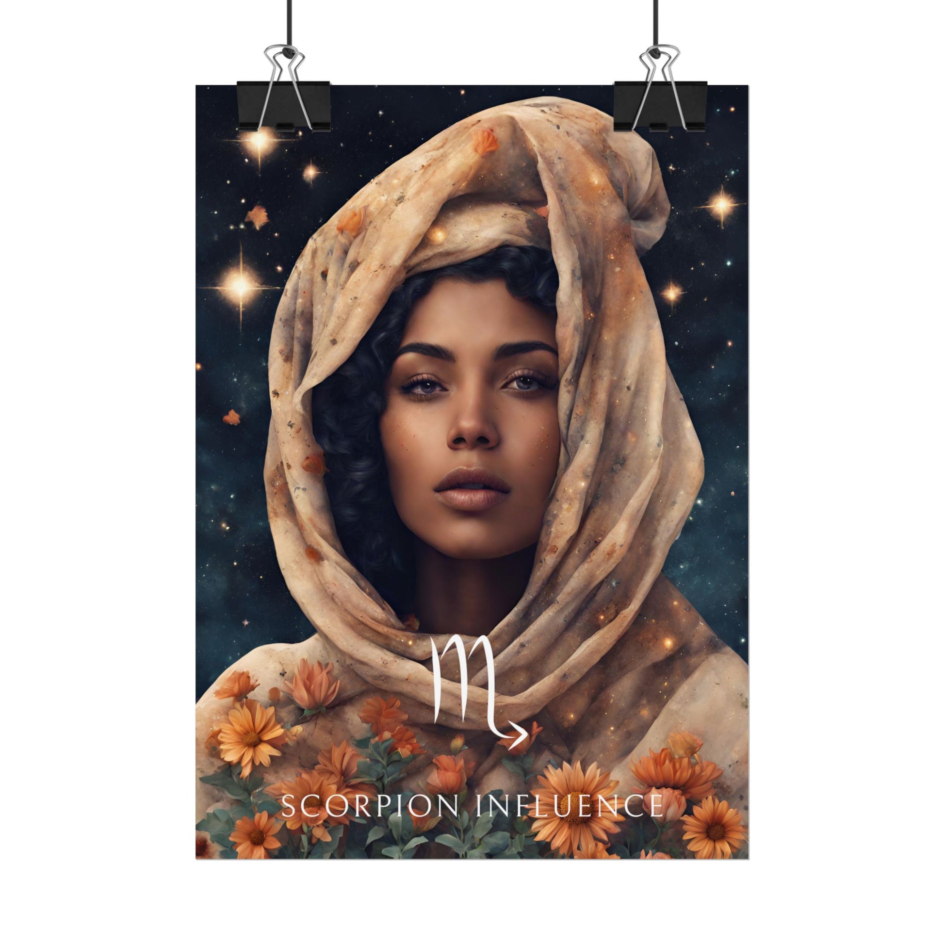 Apportez une atmosphère intense et captivante à votre intérieur avec ce poster spécialement conçu pour les femmes nées sous le signe du Scorpion. Entourée de fleurs sous un ciel étoilé, Jihane incarne l'essence de ce signe d'eau, mystérieux et passionné.