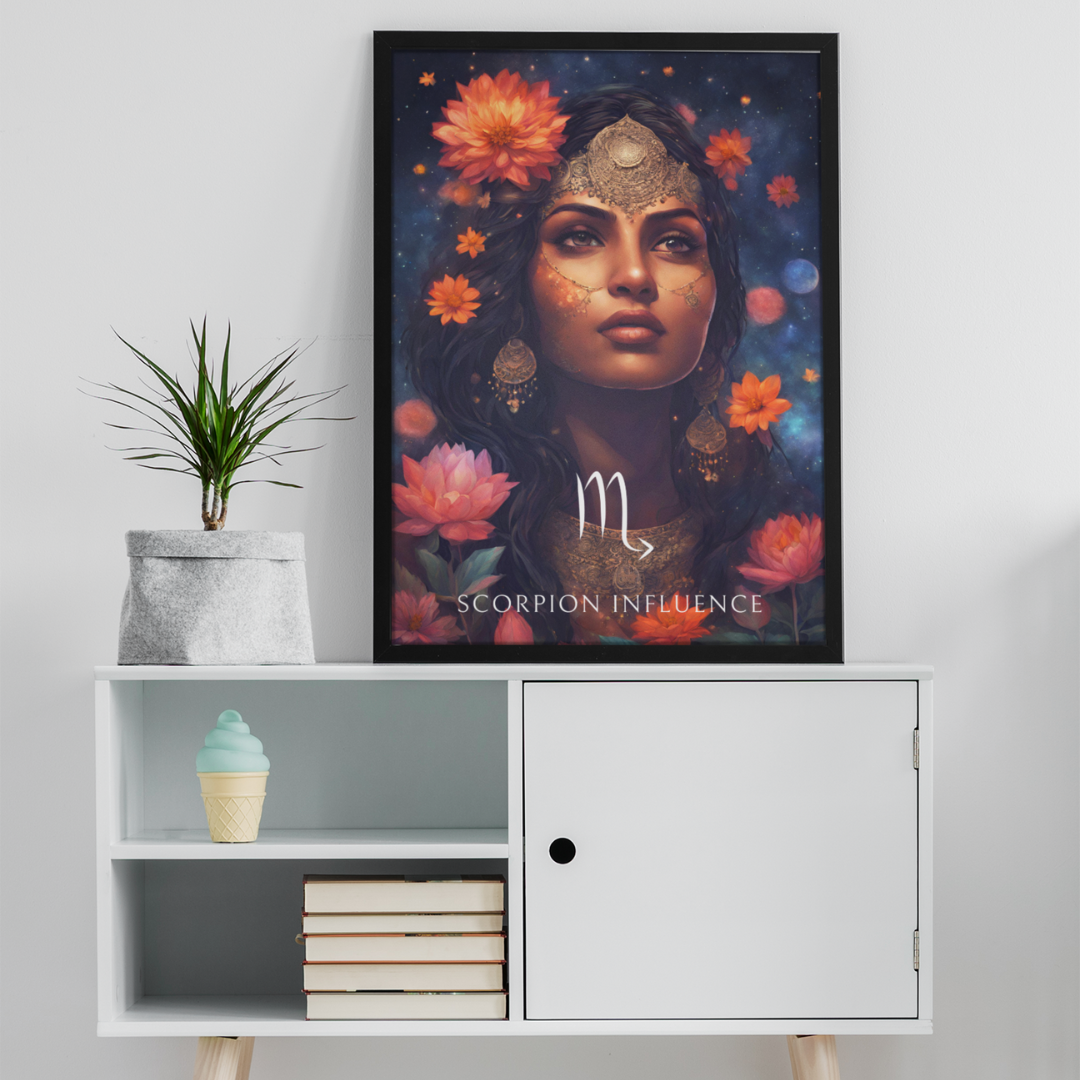 Apportez une atmosphère intense et captivante à votre intérieur avec ce poster spécialement conçu pour les femmes nées sous le signe du Scorpion. Entourée de fleurs sous un ciel étoilé, Lakshmi incarne l'essence de ce signe d'eau, mystérieux et passionné.