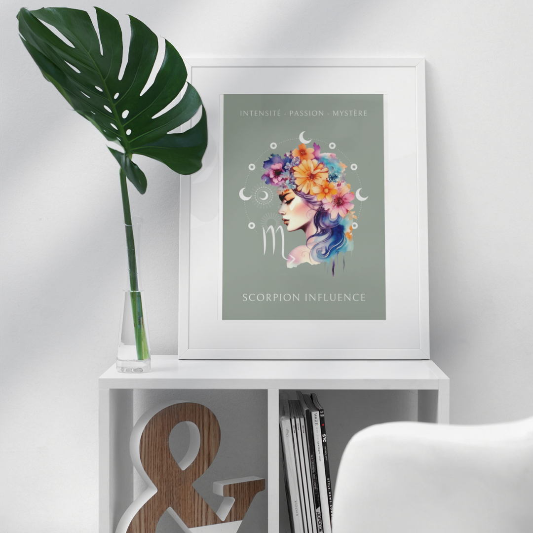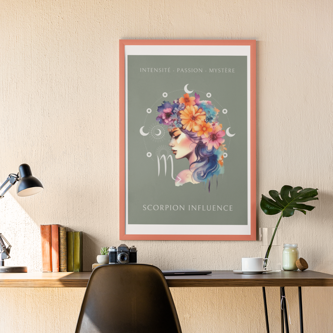 Exprimez l'intensité et la profondeur du signe du Scorpion avec ce magnifique poster, conçu pour les femmes nées sous ce signe d'eau. L’illustration de Léa, entourée de fleurs, capture l’essence du Scorpion tout en mettant en avant ses qualités uniques : intensité, passion et mystère.