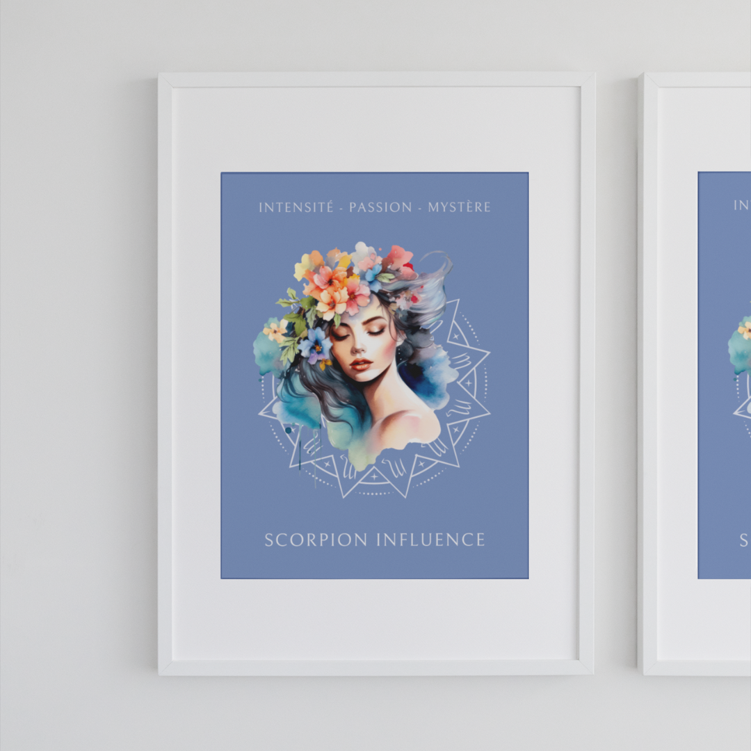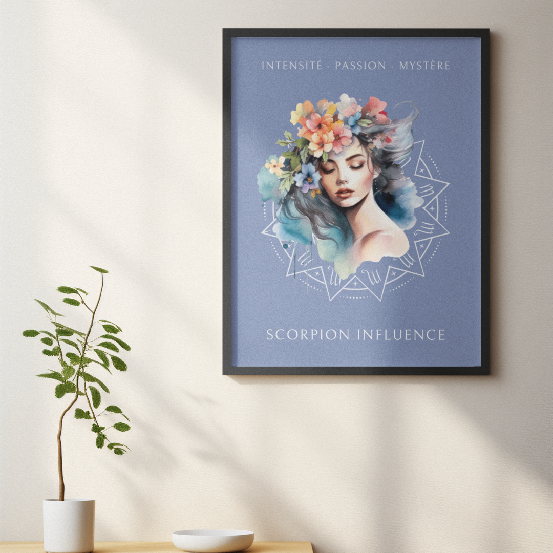 Exprimez l'intensité et la profondeur du signe du Scorpion avec ce magnifique poster, conçu pour les femmes nées sous ce signe d'eau. L’illustration de Mélody, entourée de fleurs, capture l’essence du Scorpion tout en mettant en avant ses qualités uniques : intensité, passion et mystère.