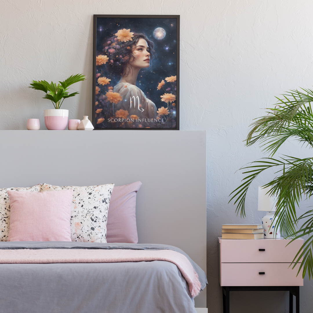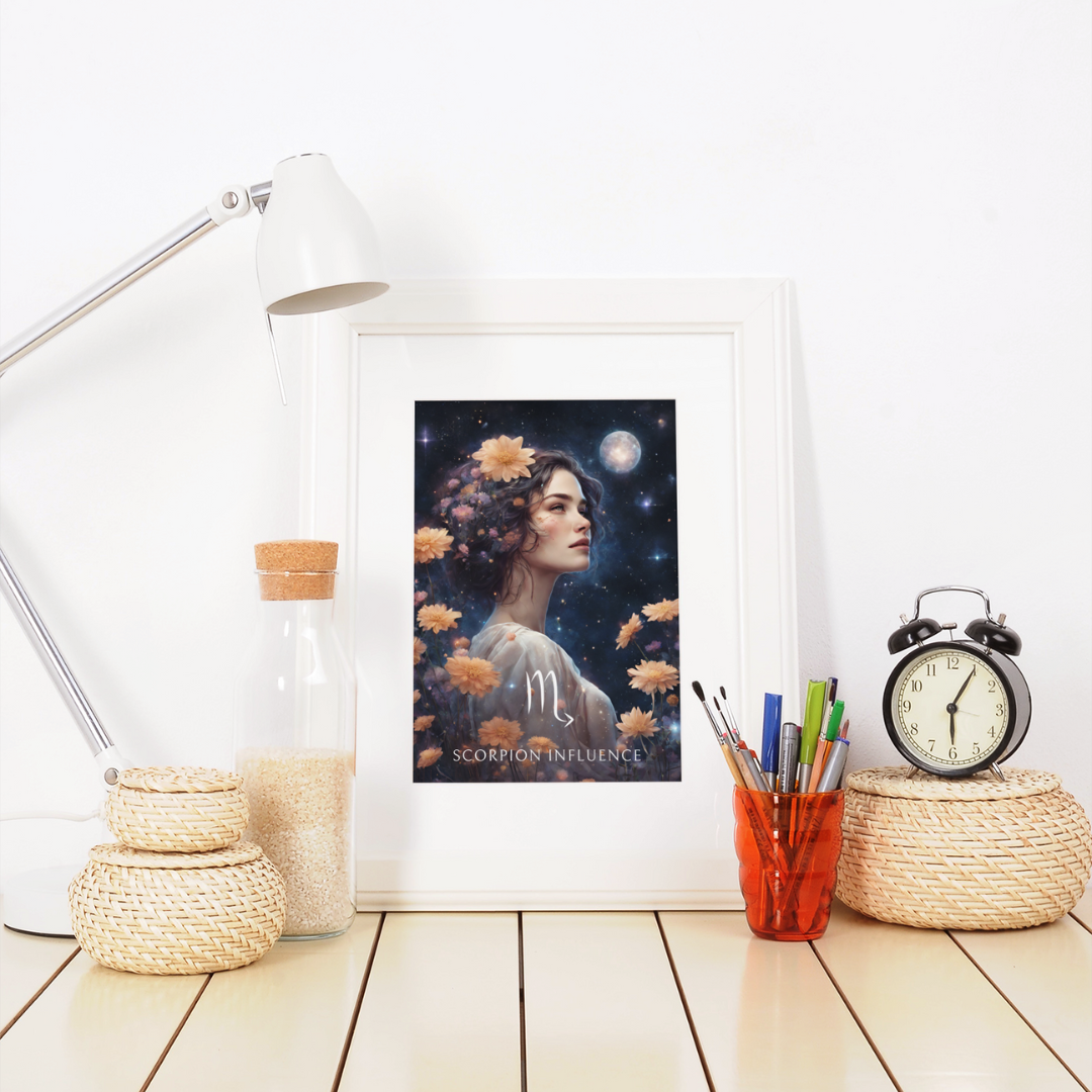 Apportez une atmosphère intense et captivante à votre intérieur avec ce poster spécialement conçu pour les femmes nées sous le signe du Scorpion. Entourée de fleurs sous un ciel étoilé, Sophie incarne l'essence de ce signe d'eau, mystérieux et passionné.