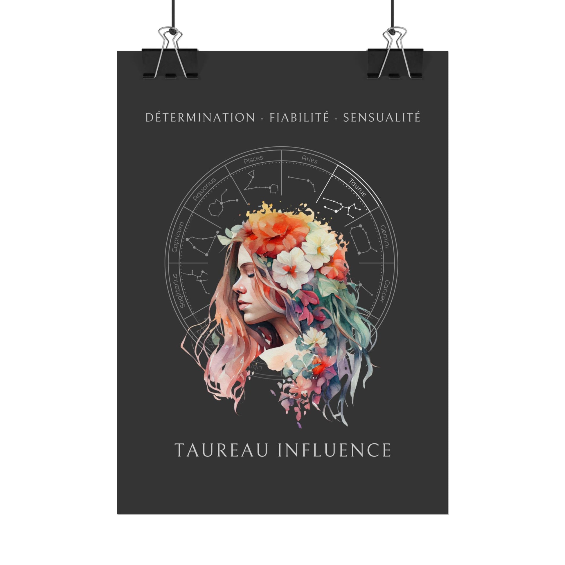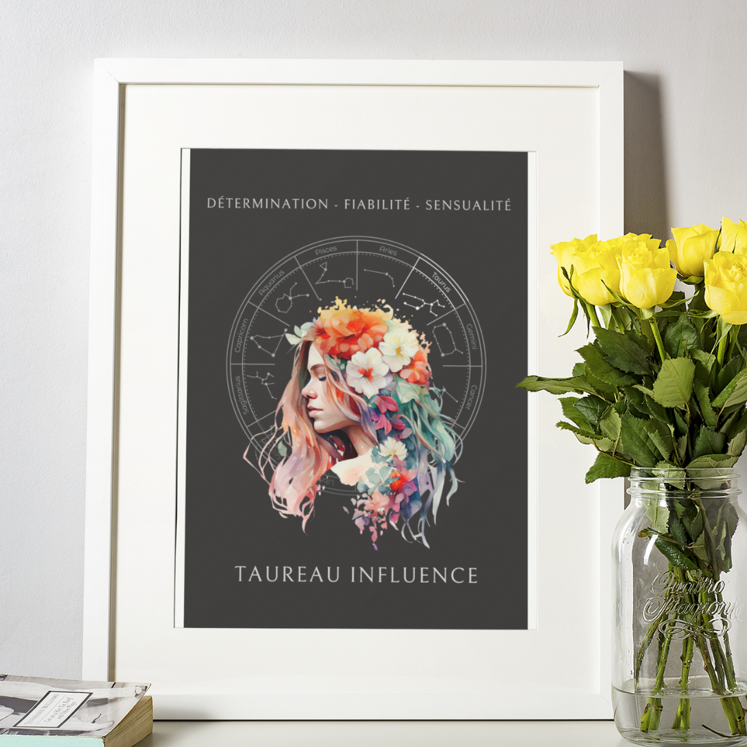 Exprimez la force et la sensualité du signe du Taureau avec ce magnifique poster, spécialement conçu pour les femmes nées sous ce signe de terre. L’illustration de Fanny, ornée de fleurs, incarne l’essence du Taureau tout en mettant en avant ses qualités uniques : détermination, fiabilité et sensualité.